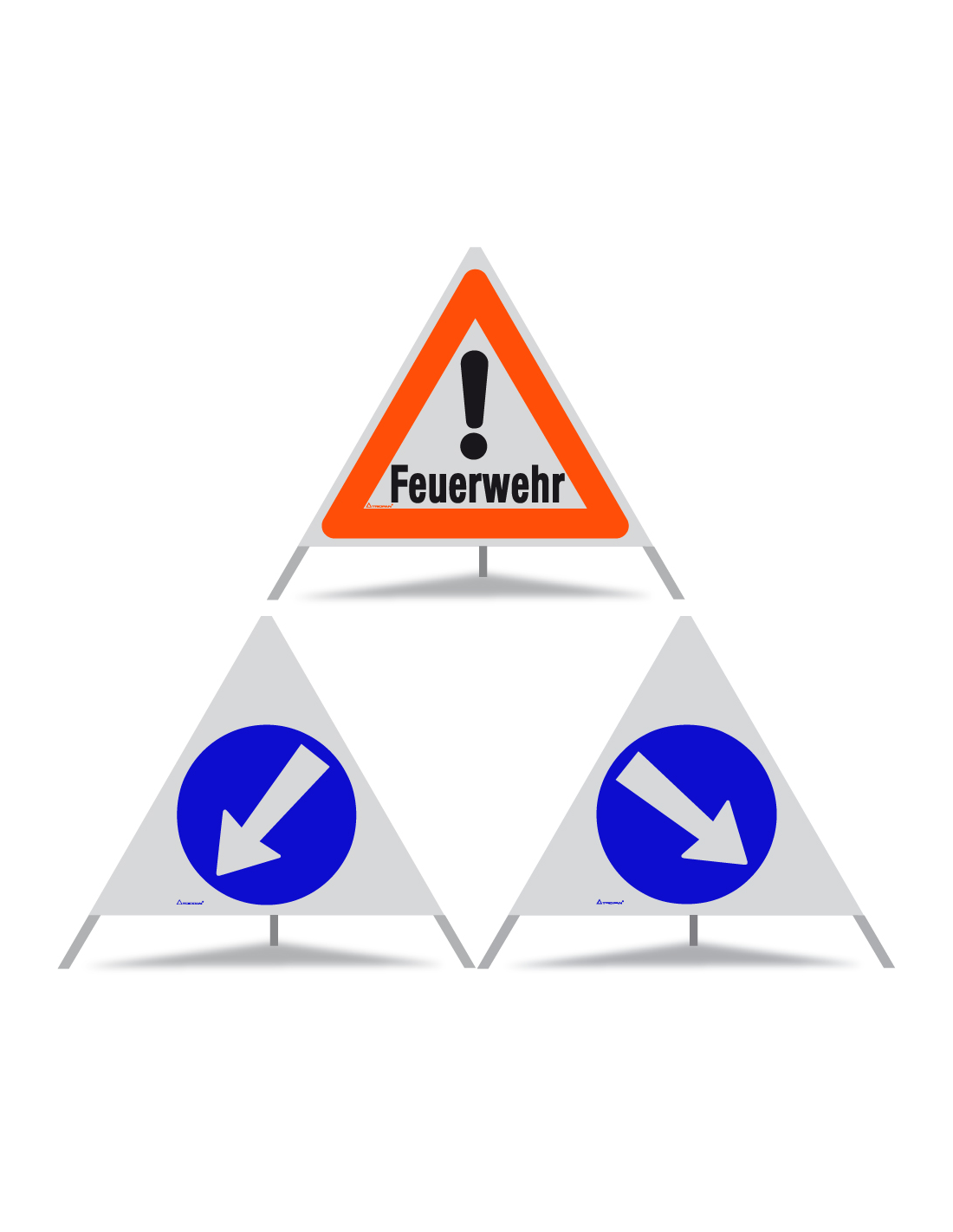 Dieses reflektierende Faltsignal ist ein unverzichtbares Zubehör für den Strassenverkehr. Mit den deutlichen Piktogrammen für die Feuerwehr sowie Richtungspfeilen links und rechts hilft es dabei, Gefahrenstellen und Hindernisse frühzeitig zu erkennen und zu umfahren.