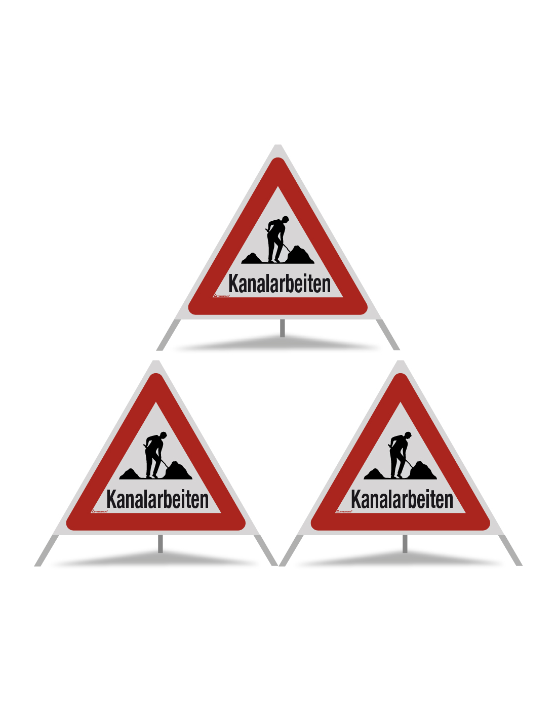 Das Faltsignal eignet sich besonders gut für den Einsatz bei Kanalarbeiten in der Schweiz. Die Beschriftung "Kanalarbeiten" ist innen im Dreieck positioniert und entspricht den Verkehrszeichen-Codes des Einsatzlandes und der Schweiz (1.14).
