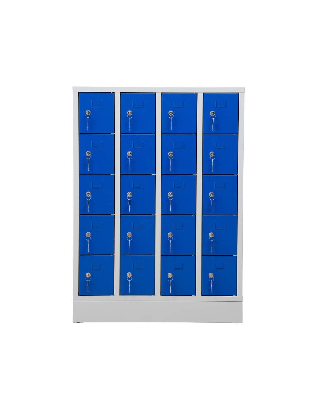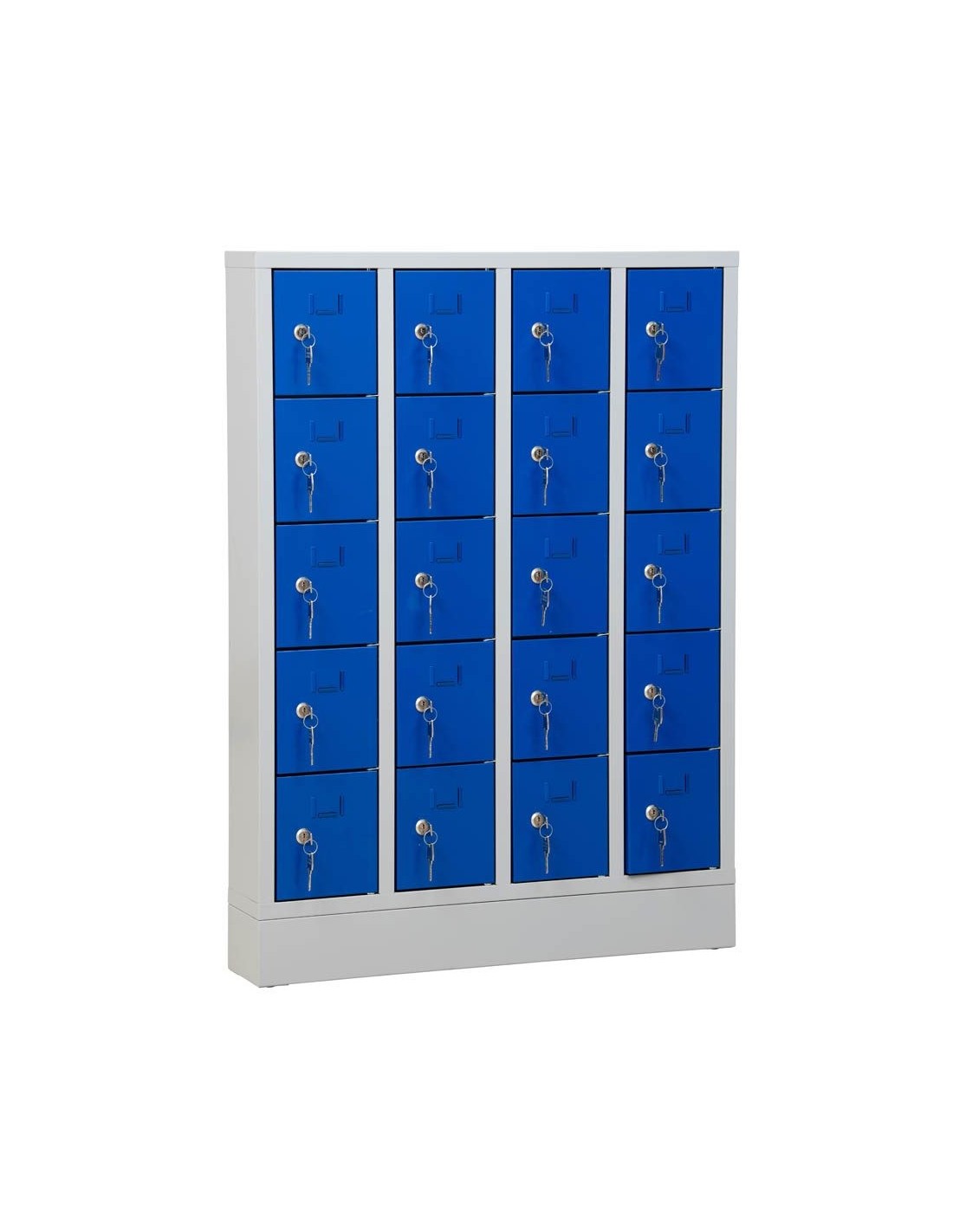 Die 20 Schliessfächer sind ideal zur Aufbewahrung von persönlichen Gegenständen oder Kleidung. Angeordnet sind sie in 4 Abteilen. Bei einer Breite von 20,0 cm pro Fach ist genügend Stauraum vorhanden. Beachten Sie ausserdem diese besondere Eigenschaft: mit Sockel.