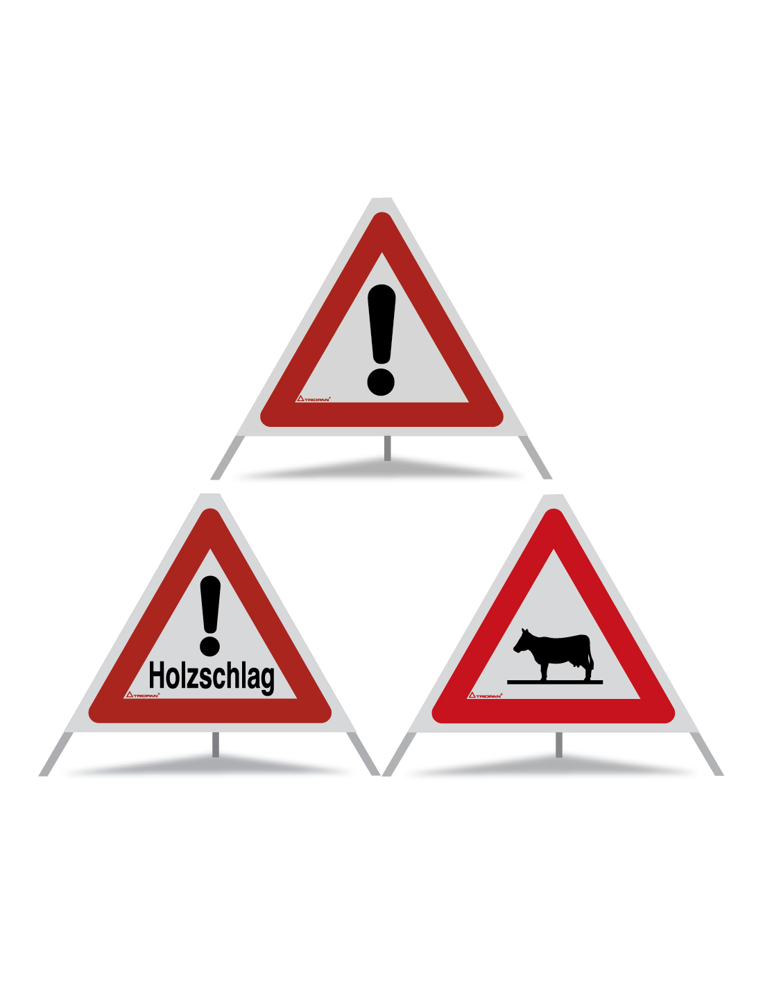 Das Faltsignal kann vielseitig eingesetzt werden, z.B. als Warnung vor anderen Gefahren, Holzschlag oder mit einem Kuhsymbol für landwirtschaftliche Bereiche.