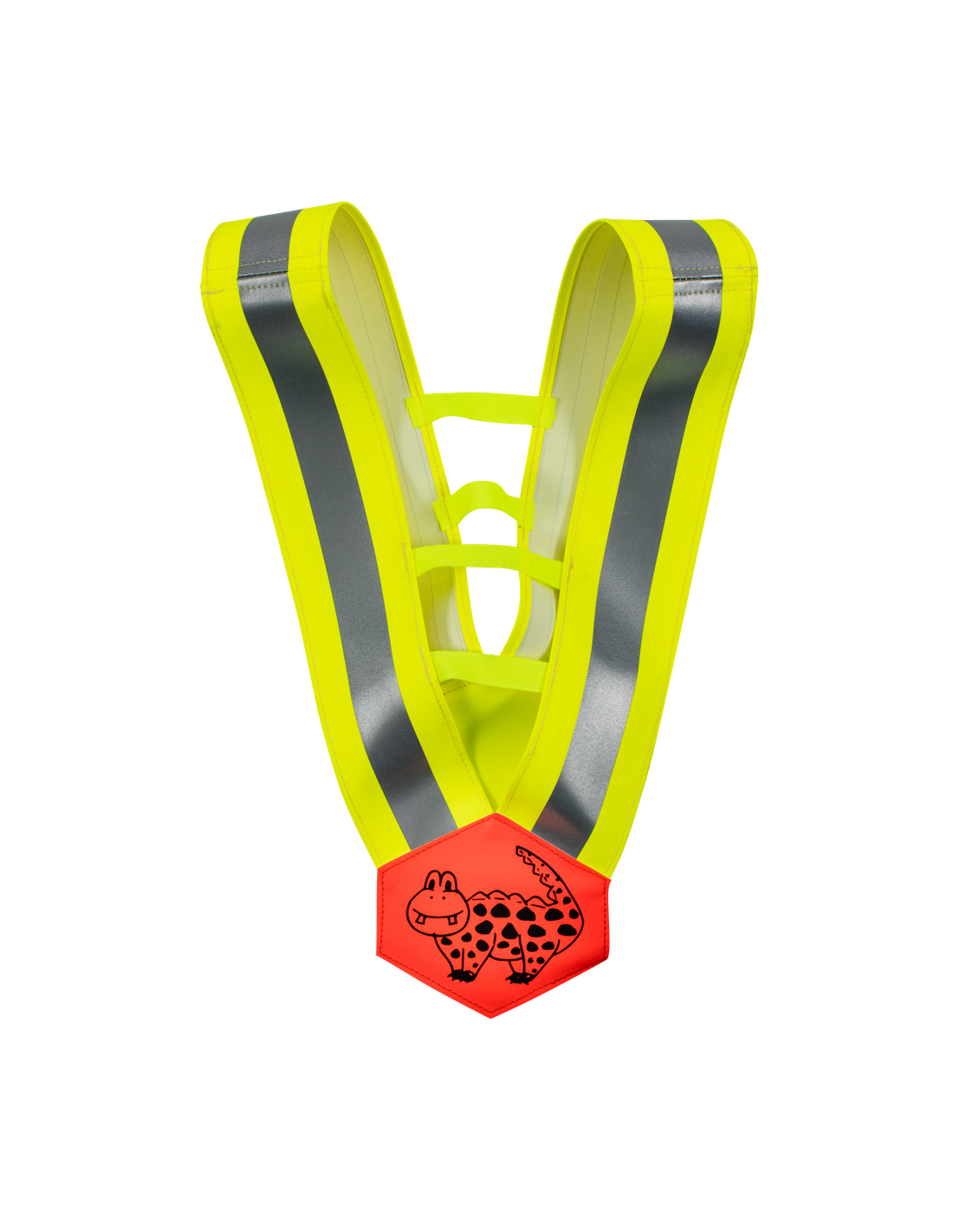 Die Diamant-Gurt gelb in der Ausführung Dino ist die perfekte Wahl, um Kinder sicher und sichtbar durch den Verkehr zu begleiten.