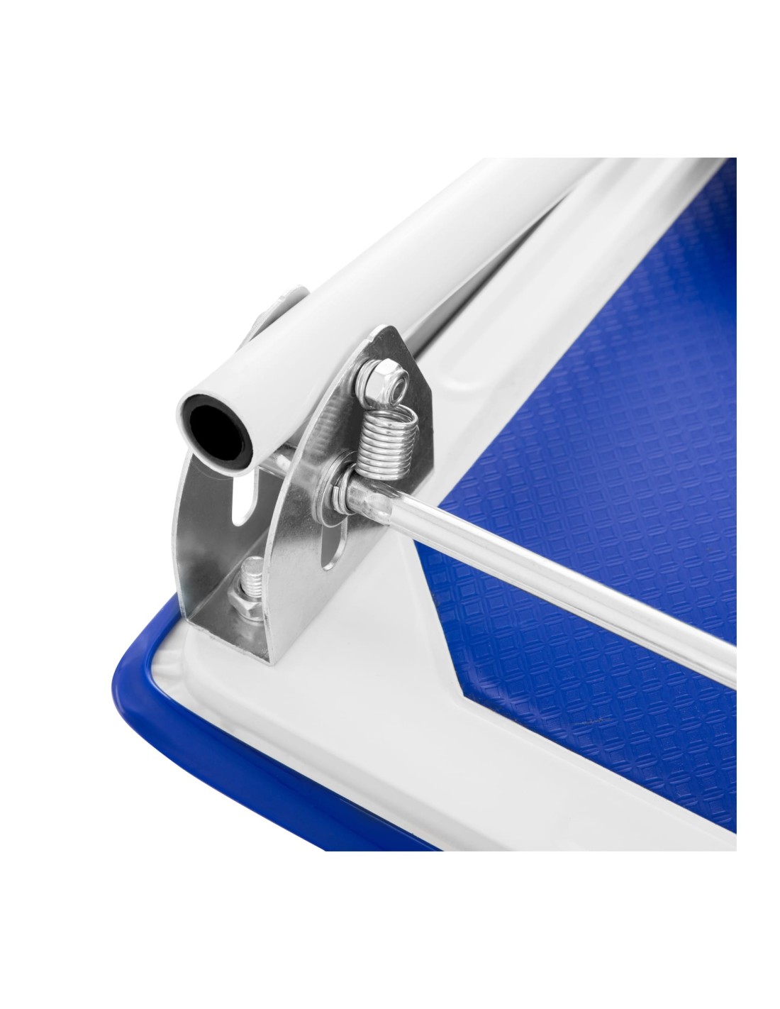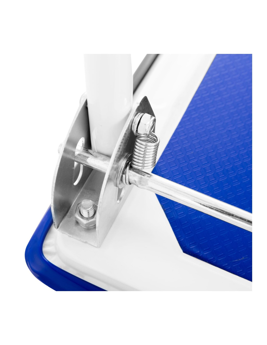 Der klappbare Bügelgriff ermöglicht eine platzsparende Lagerung und einfache Handhabung. Die Plattformgrösse von 880 x 580 mm mit Antirutschoberfläche sorgt für sicheren Transport von Waren. Feststellbremsen an den Lenkrollen gewährleisten einen stabilen Stand während Beladung und Entladung.