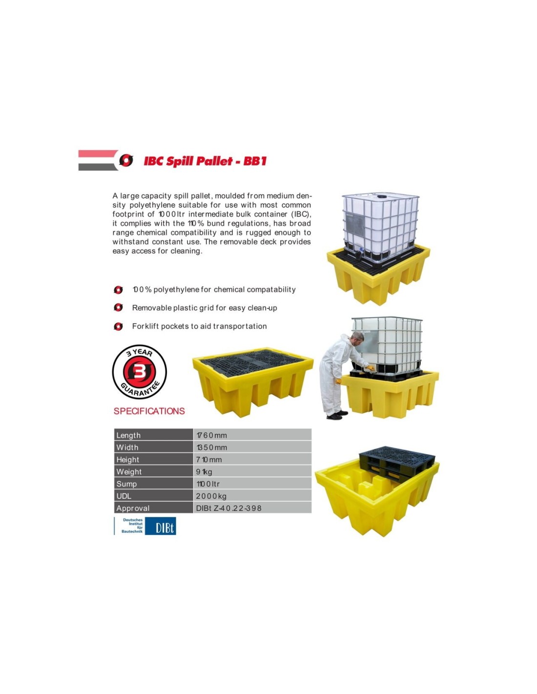 Die IBC Auffangpalette mit bietet eine zuverlässige und sichere Lösung für die Lagerung von Gefahrstoffen. Mit ihrem massiven und langlebigen Design schützt sie Ihre Arbeitsumgebung effektiv vor auslaufenden Flüssigkeiten. Das herausnehmbare Gitter erleichtert die Reinigung und Wartung erheblich und sorgt so für eine besonders lange Lebensdauer dieses Produkts. Dank der DIBt Z-40.22-398 entspricht diese Auffangpalette höchsten Sicherheitsstandards und ist die perfekte Wahl für Industrie, Lager und Werkstatt.