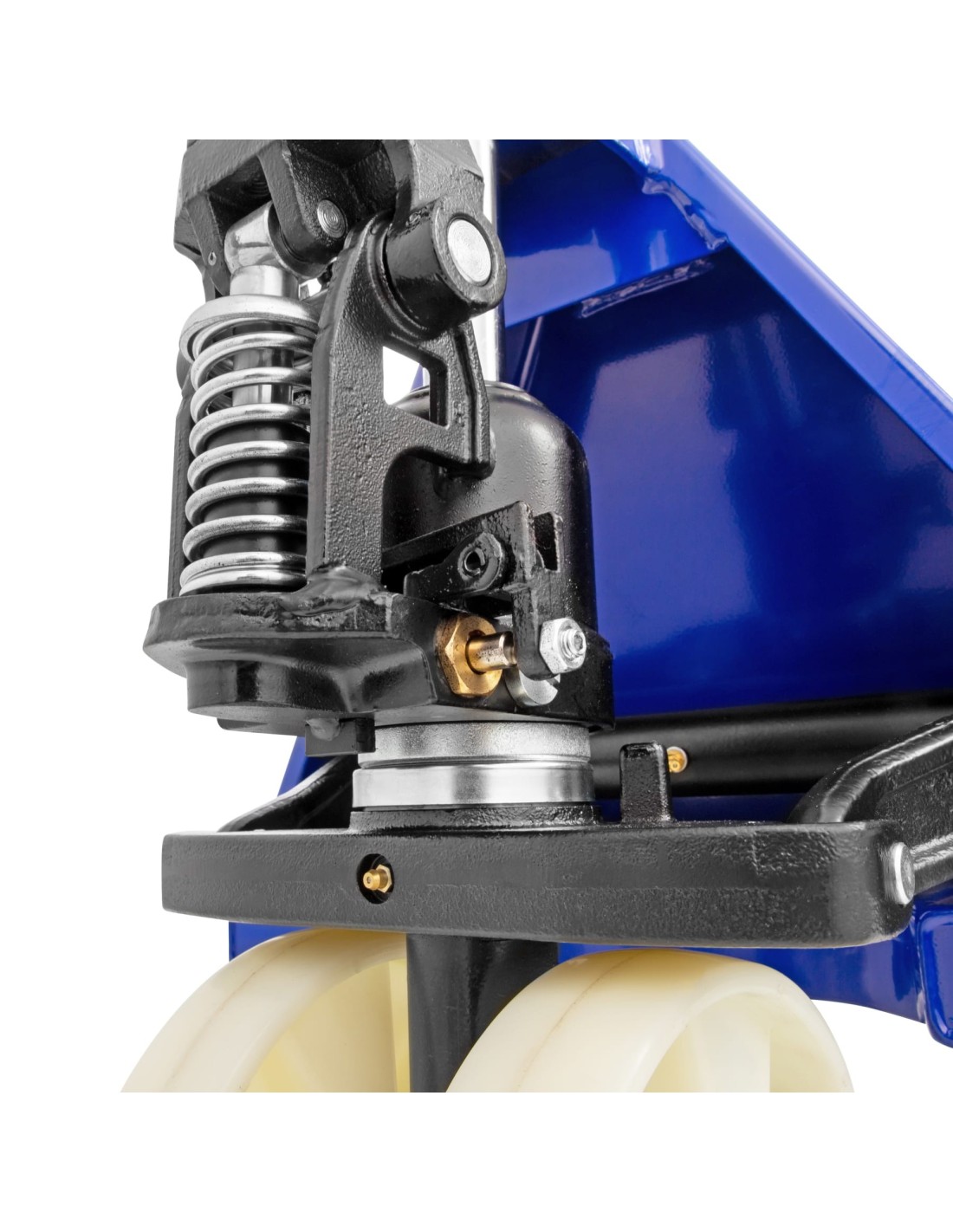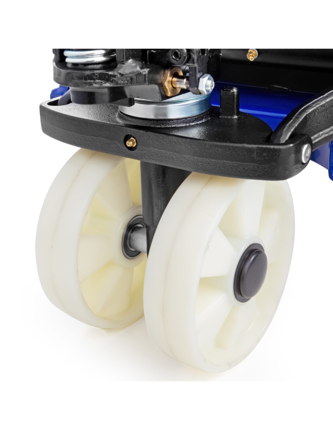 - Hohe Wendigkeit: Dank der Single-Laufrollen kann der Hubwagen Paletten leichtgängig manövrieren, was die Arbeit erleichtert.