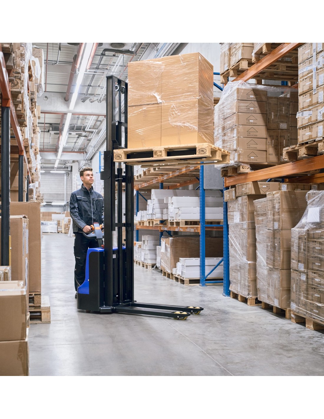 Der Elektro-Hochhubwagen eignet sich ideal zum Kommissionieren, Stapeln und Transportieren auf glatten, ebenen Böden. Durch seine kompakte Bauhöhe von 1.744 mm passt er problemlos durch Standardtüren und ist somit vielseitig einsetzbar.