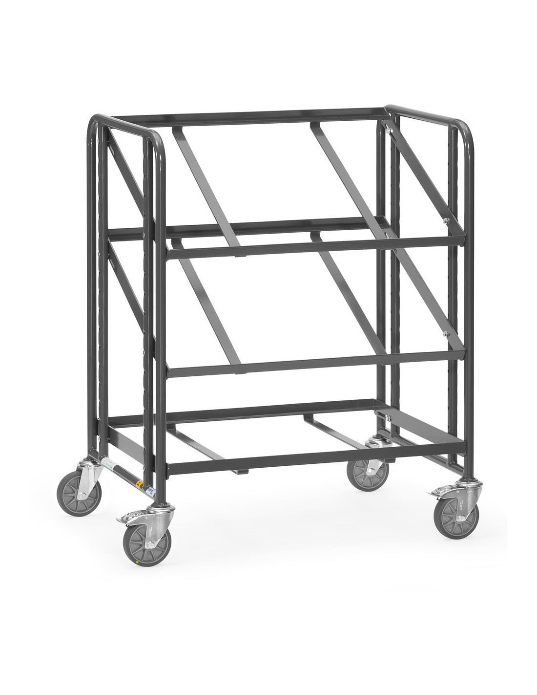 Technische Merkmale: Der Wagen besteht aus Stahlrohr und Profilstahl, ist elektrisch leitfähig und pulverbeschichtet in schickem schiefergrau RAL 7015. Er verfügt über 4 Lenkrollen mit ESD-Bereifung und Naben mit Präzisions-Rillenkugellager.