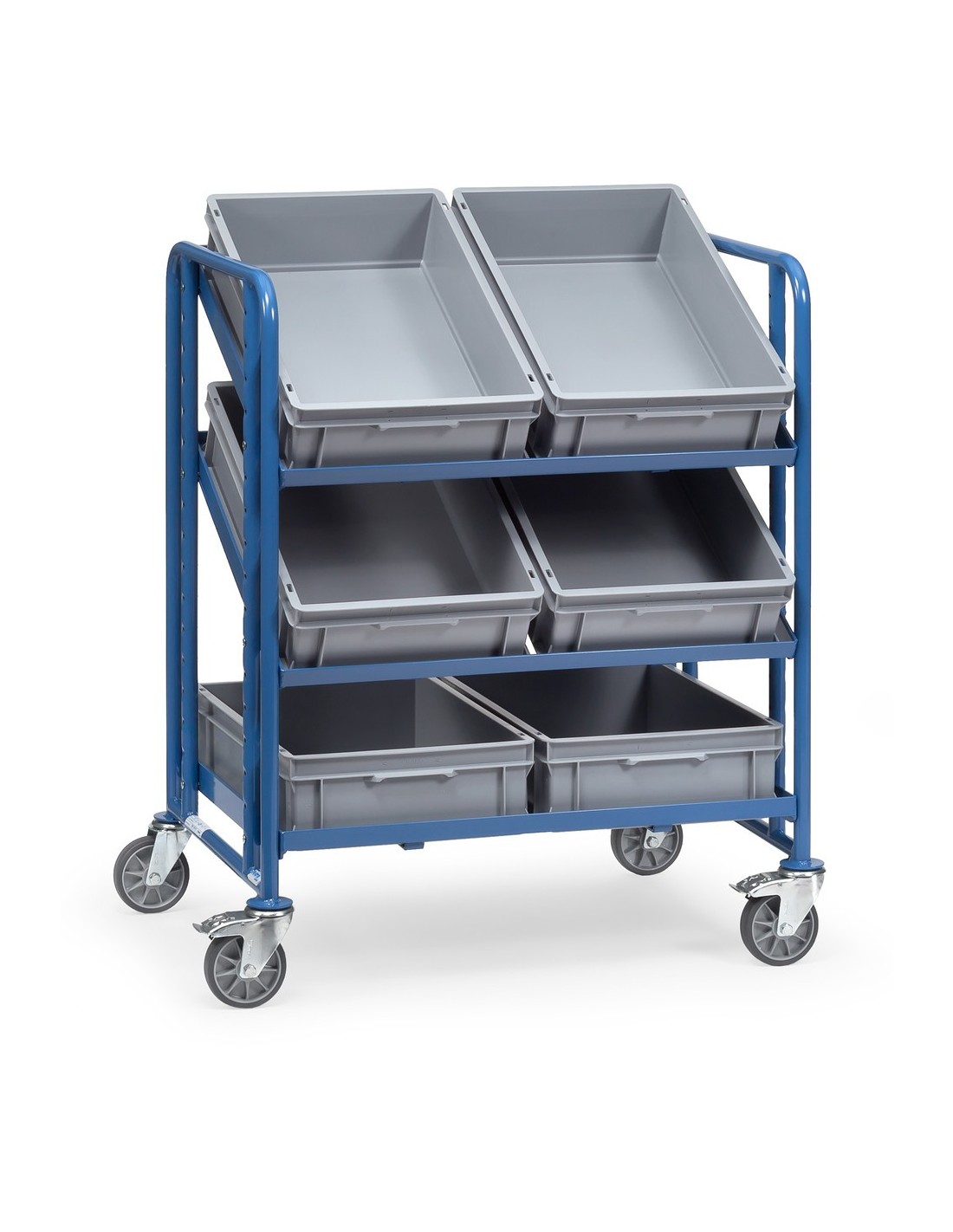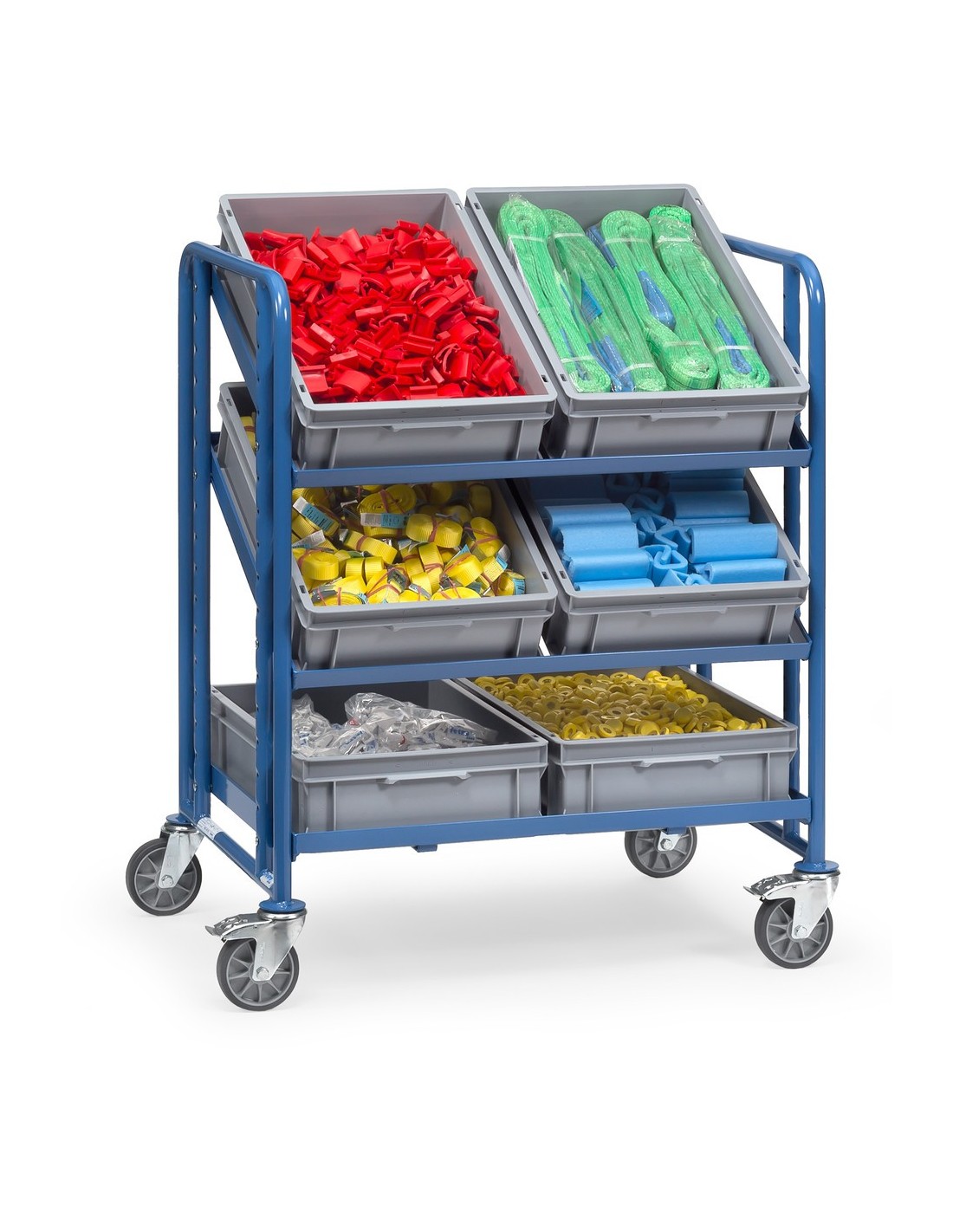 Dieser Eurokasten-Wagen eignet sich ideal für den Transport von Systemteilen, Werkzeugen oder anderen Materialien in Lagerhallen, Werkstätten oder Produktionsstätten.