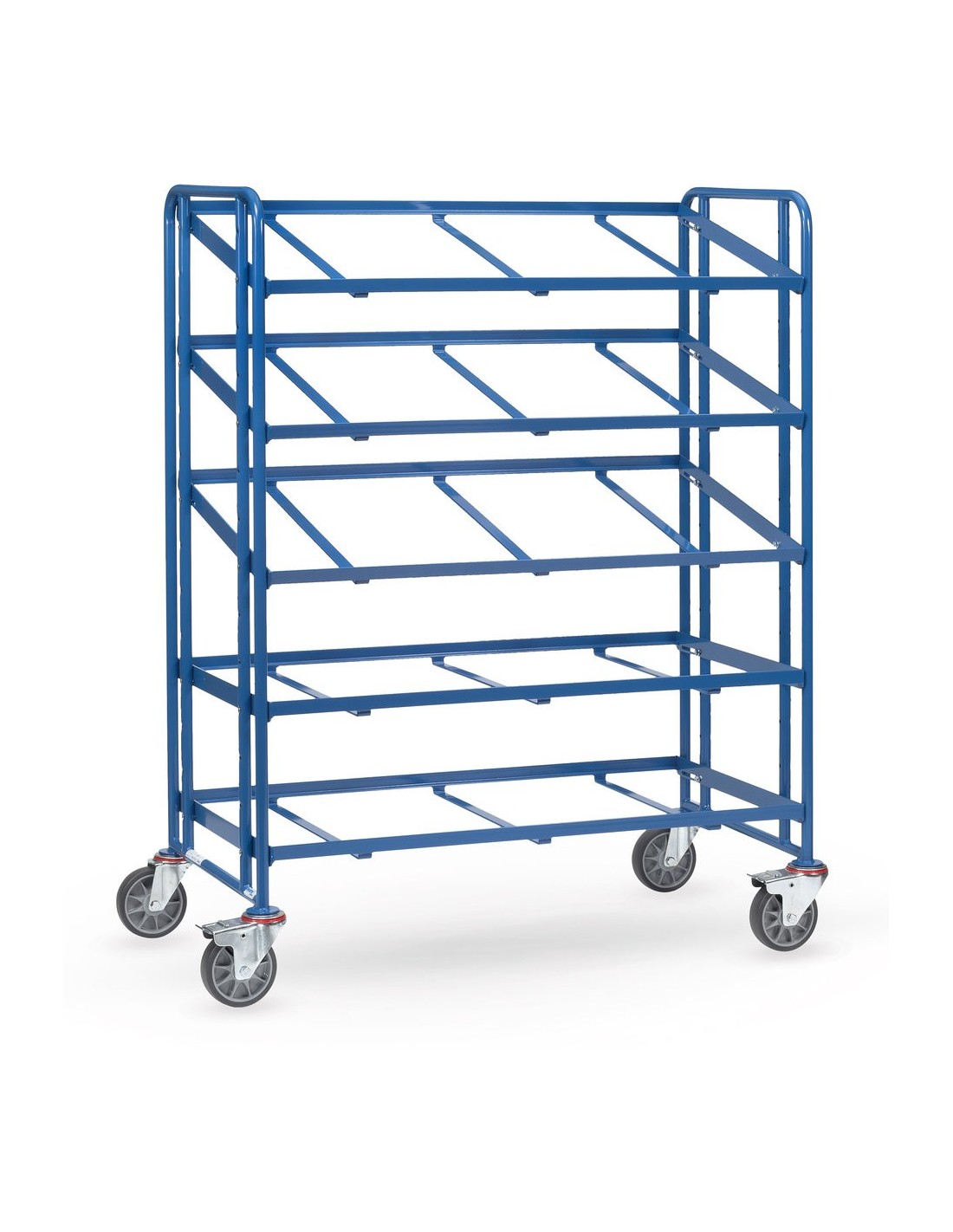 Der Wagen verfügt über 4 Lenkrollen, die eine gute Beweglichkeit in alle Richtungen ermöglichen. Die Naben sind robust und widerstandsfähig gelagert, weitgehend wartungsfrei und stossunempfindlich. Zwei der Rollen sind mit Feststellern ausgestattet, die gemäss der Europäischen Norm EN1757-3 die Sicherheit des Wagens gewährleisten.