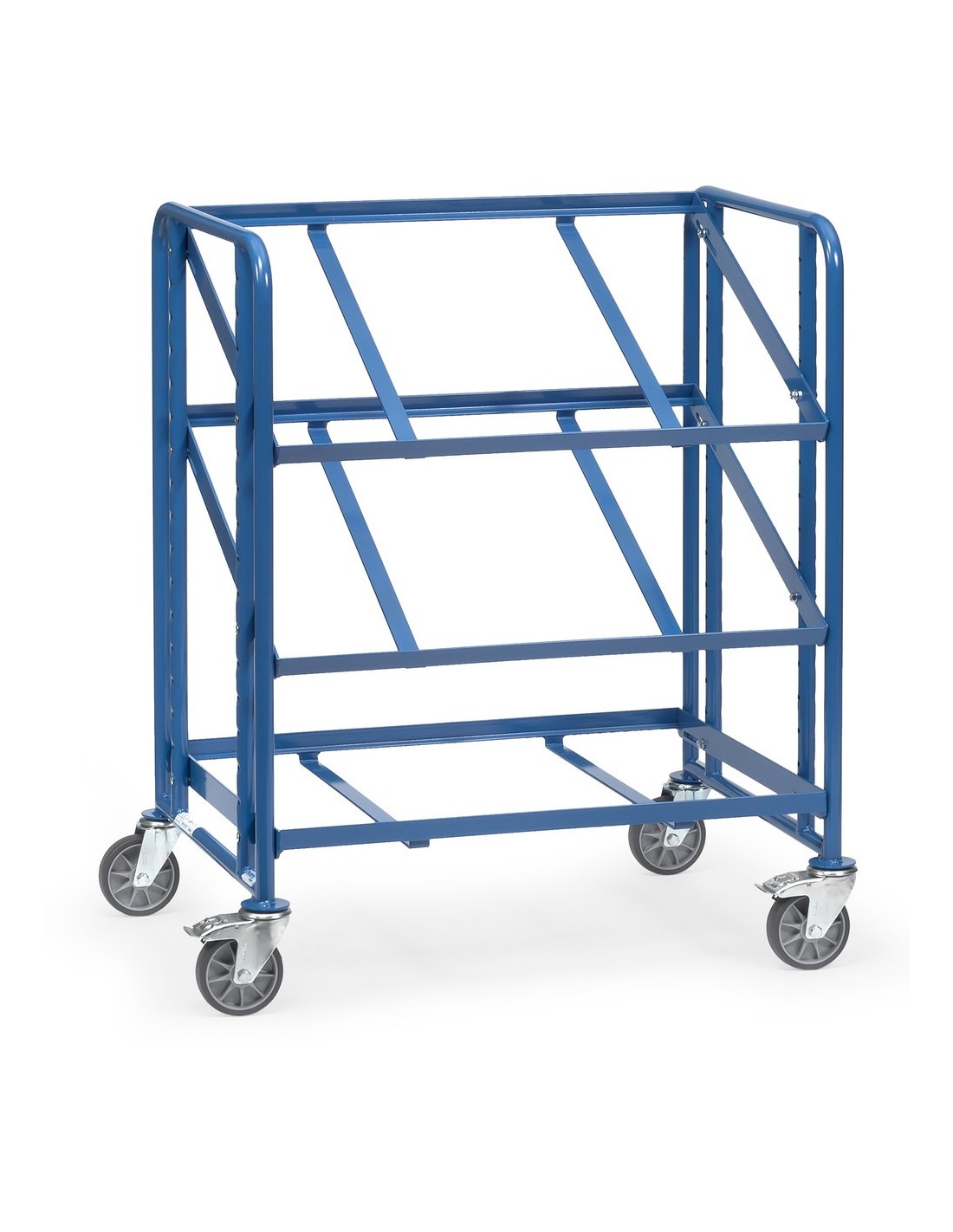 Der Eurokasten-Wagen bietet vielseitige Einsatzbereiche, insbesondere für den Transport von Systemteilen in Basiselementen. Die Etagenrahmen sind variabel einschraubbar und ermöglichen eine Neigung von 15° oder 30°. Die obere und mittlere Ladefläche haben eine Tragkraft von 60 kg und bieten Platz für je 2 Eurokästen.
