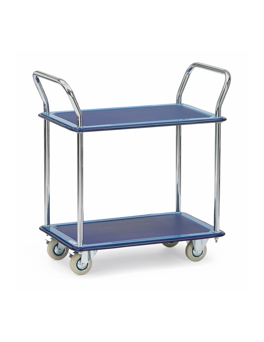Tischwagen mit 2 Stahlblech-Plattformen, Antirutschbelag, Schutzleiste und glanzverzinktem Rohrschiebebügel. 2 Lenk- und 2 Bockrollen mit Feststellern gemäss EN 1757-3. Tragkraft obere Plattform 60 kg.