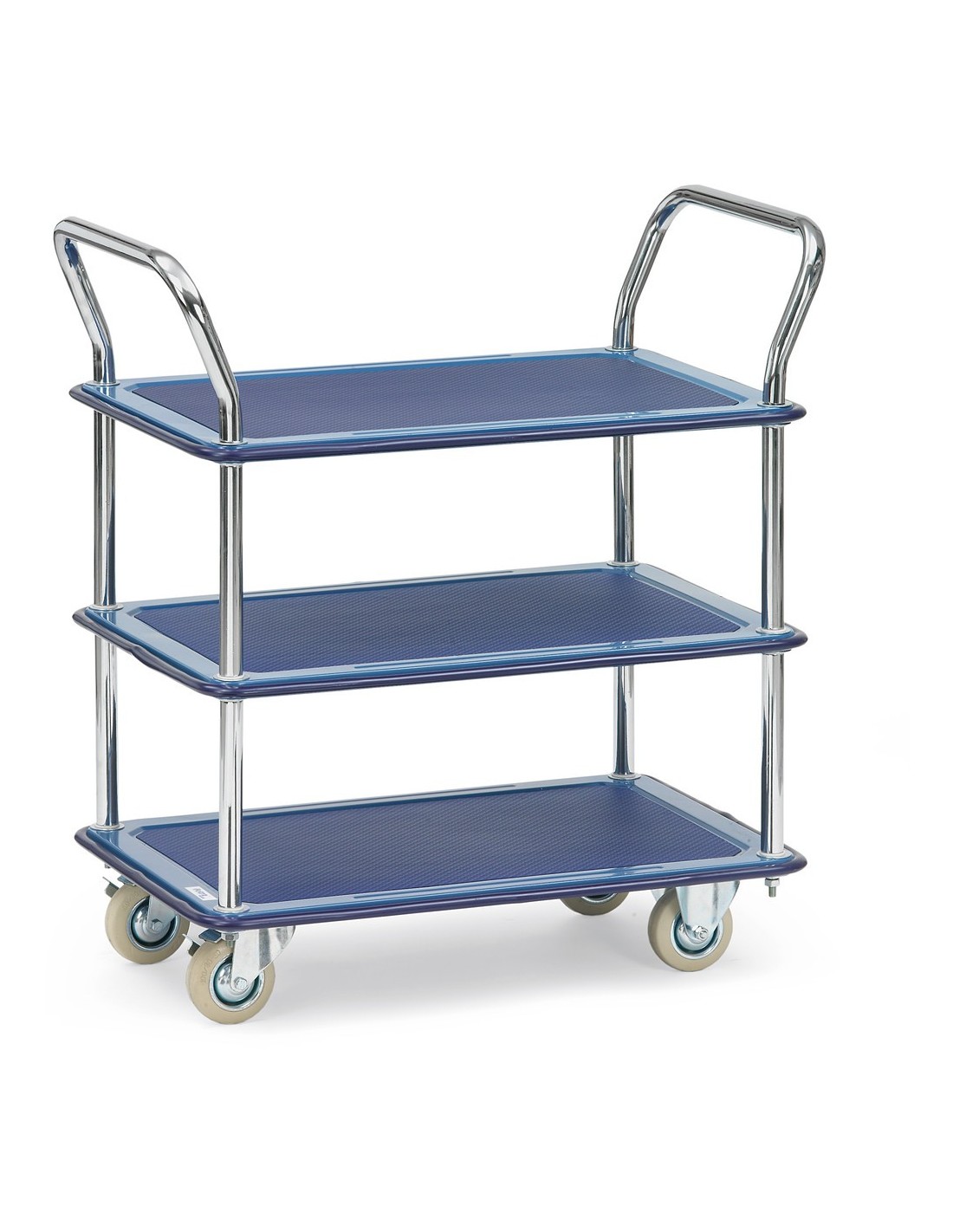 Tischwagen mit 3 Stahlblech-Plattformen, Antirutschbelag, Schutzleiste und glanzverzinktem Rohrschiebebügel. 2 Lenk- und 2 Bockrollen mit Feststellern gemäss EN 1757-3. Tragkraft obere und mittlere Plattform 60 kg.