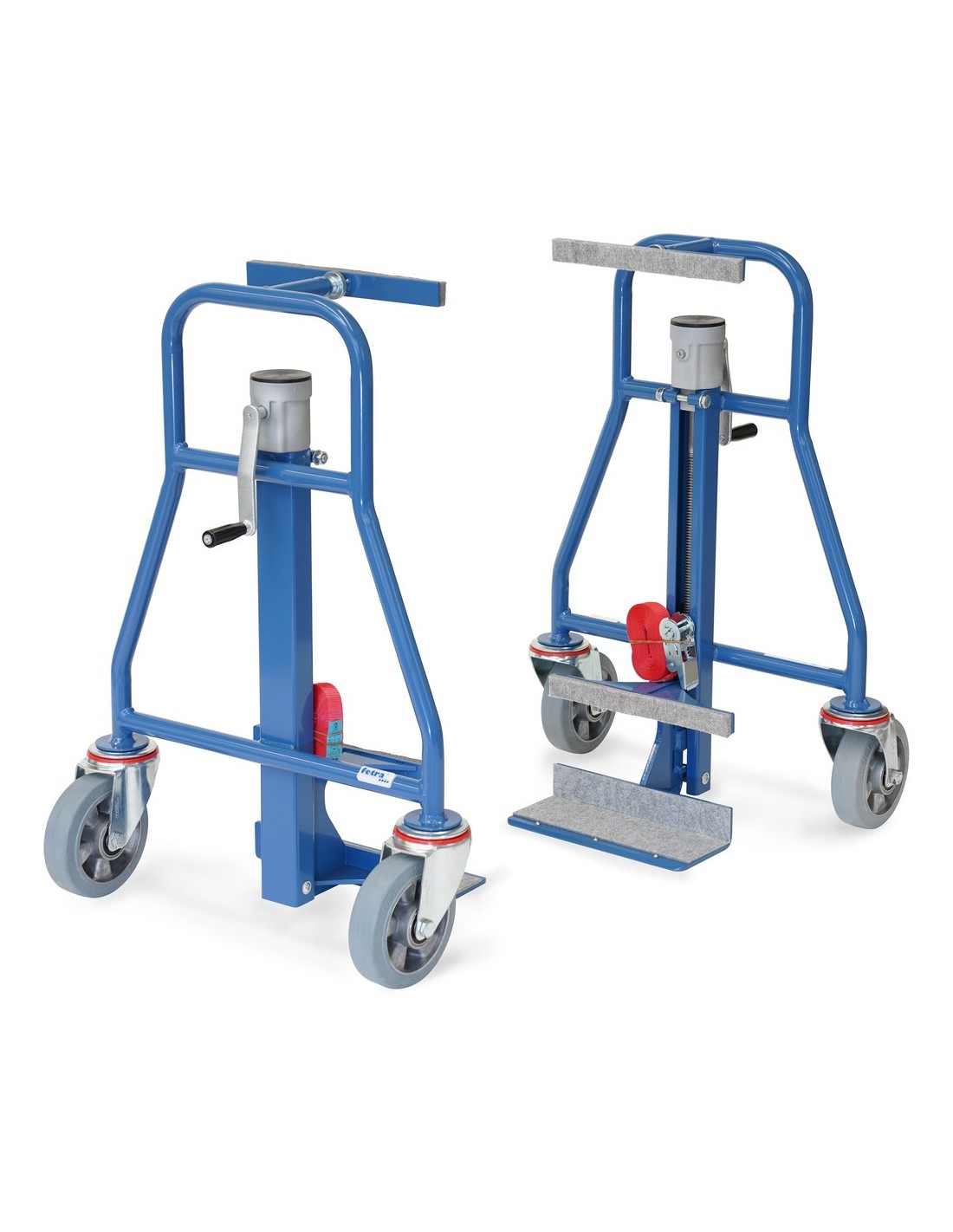 Die verstellbaren Anlagestützen mit Schonbelag sorgen für einen sicheren Halt der Möbel. Die Vollgummi-Bereifung mit Naben aus Kugellager ermöglicht eine einfache und leise Fortbewegung, auch über Kanten und Schwellen. Die Winde mit Handkurbel und der 5m lange Zurrgurt gewährleisten eine sichere Fixierung der Ladung.