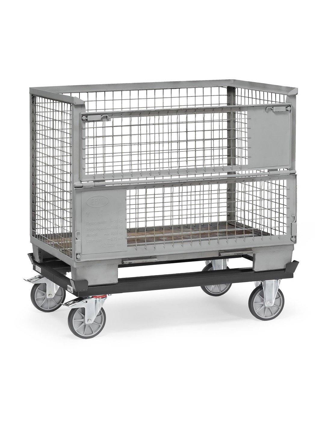 Dieses Paletten-Fahrgestell eignet sich perfekt für Lagerhäuser, Produktionsstätten, Supermärkte und andere Bereiche, in denen der Transport von Paletten und Gitterboxen erforderlich ist.