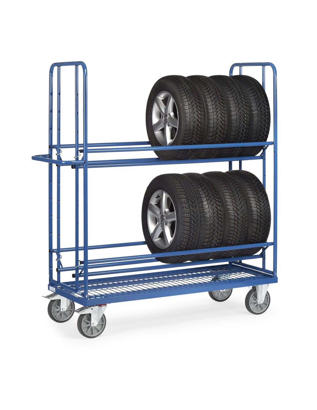 Dieser Reifenwagen von Fetra überzeugt durch seine robuste Stahlrohr- / Profilstahl-Konstruktion, die pulverbeschichtet in blau RAL 5007 ist. Mit einer Ladefläche von 1420 x 610 mm bietet er ausreichend Platz für verschiedene Reifengrössen.