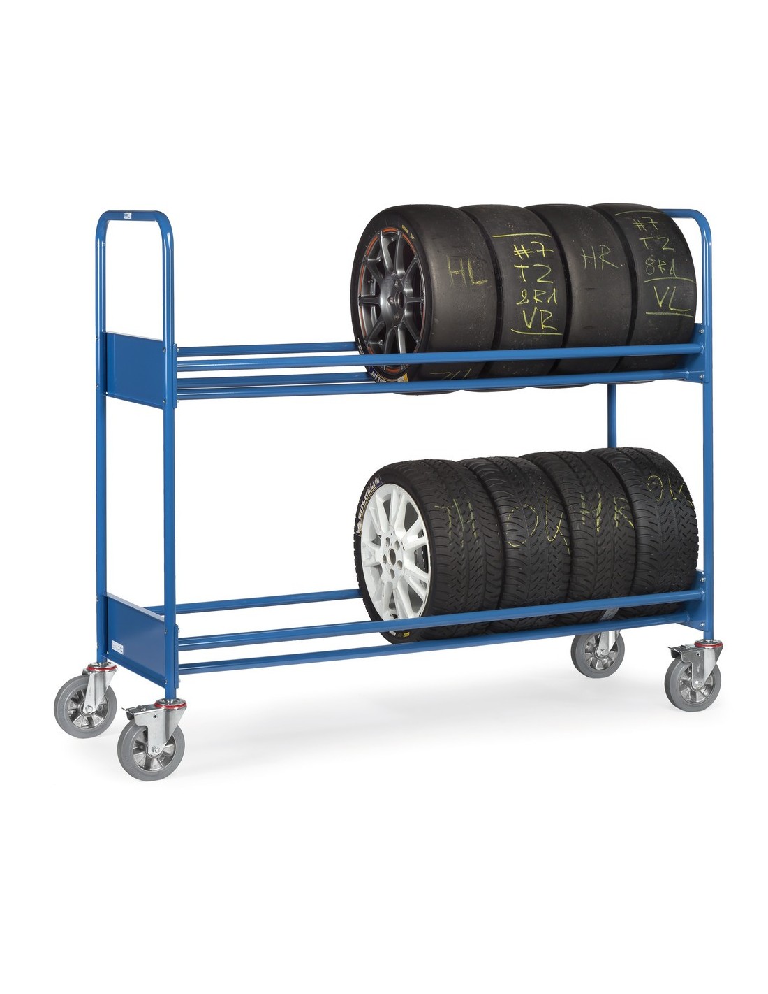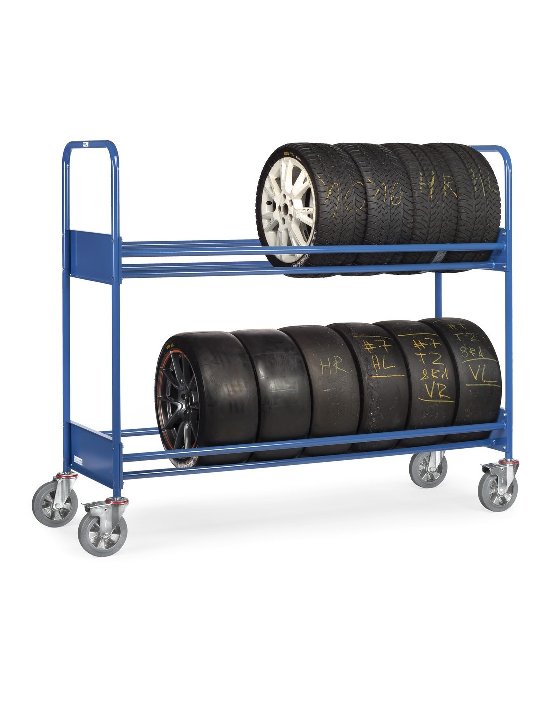 Dieser Fetra Reifenwagen in verstärkter Ausführung eignet sich ideal für den Einsatz unter hoher Beanspruchung, wie beispielsweise als Boxenwagen im Motorsport. Die pulverbeschichtete blaue Oberfläche nach RAL 5007 bietet einen dauerhaften Schutz vor äusseren Einflüssen.