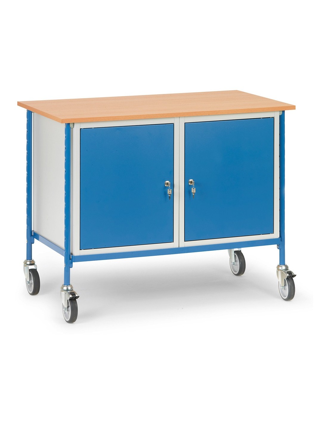 Zur praktischen Aufbewahrung verfügt der Rolltisch über 2 verschliessbare Stahlschränke mit Flügeltüren. Jeder Schrank bietet Platz für je 1 festen und 2 verstellbaren Böden mit einer Tragkraft von bis zu 30 kg pro Fachboden. Der Korpus ist in Grau (RAL 7035) gehalten, während die Türen und Fronten in Blau (RAL 5007) gestaltet sind.