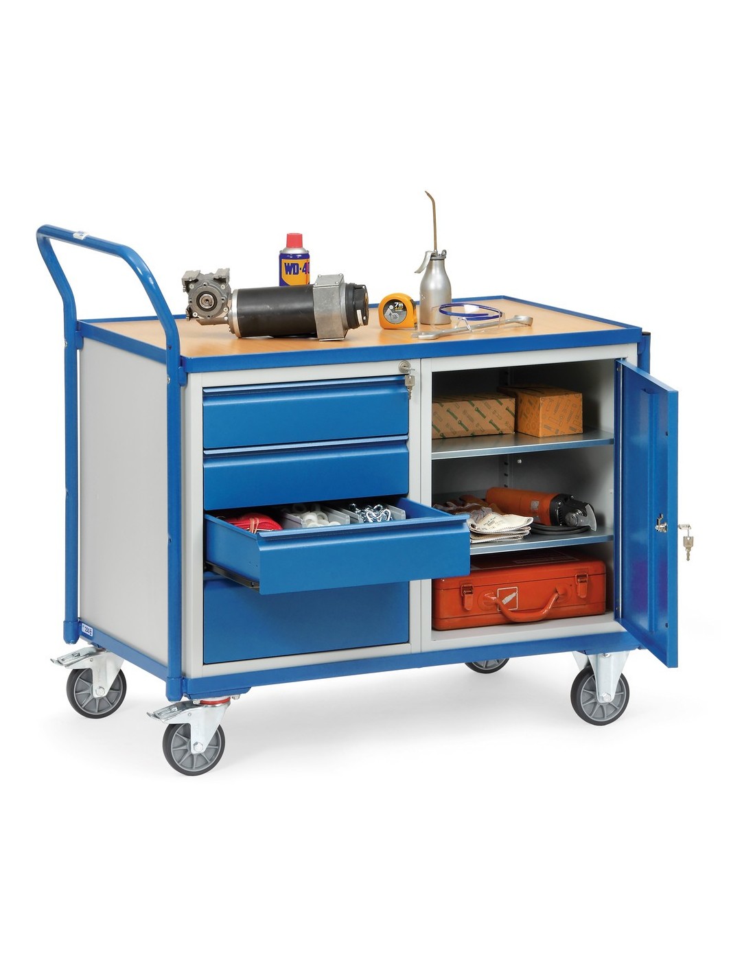 Unser Werkstattwagen von fetra ist die ideale Lösung für den täglichen Einsatz in Werkstätten. Die robuste Stahlkonstruktion bietet ausreichend Platz für Werkzeug und Material, während der abschliessbare Schrank und die Schubladen für Ordnung sorgen. Die umlaufende Arbeitsplatte ermöglicht es, kleinere Arbeiten mobil durchzuführen und flexibel zu arbeiten.