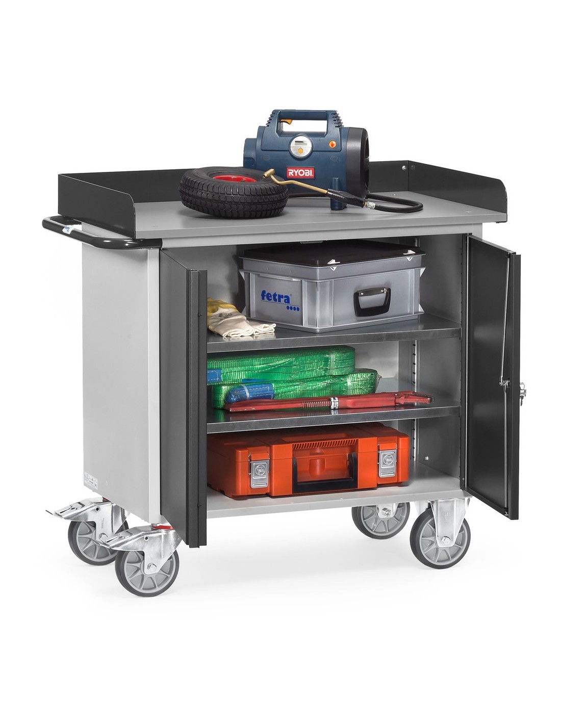 Fetra Werkstattwagen mit 1 zweitürigem Schrank, Arbeitsplatte mit Abrollrand, Grey Edition