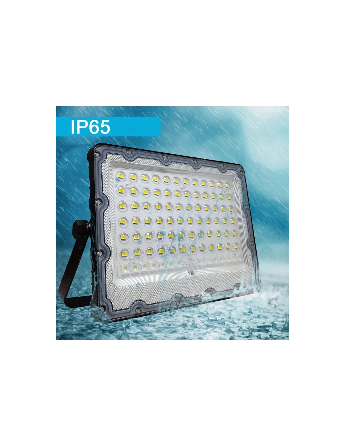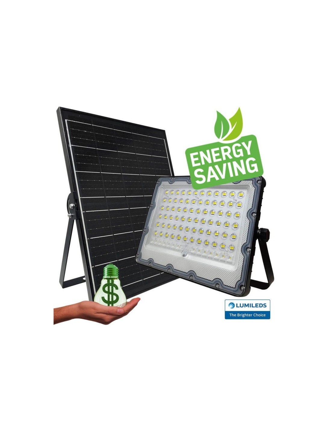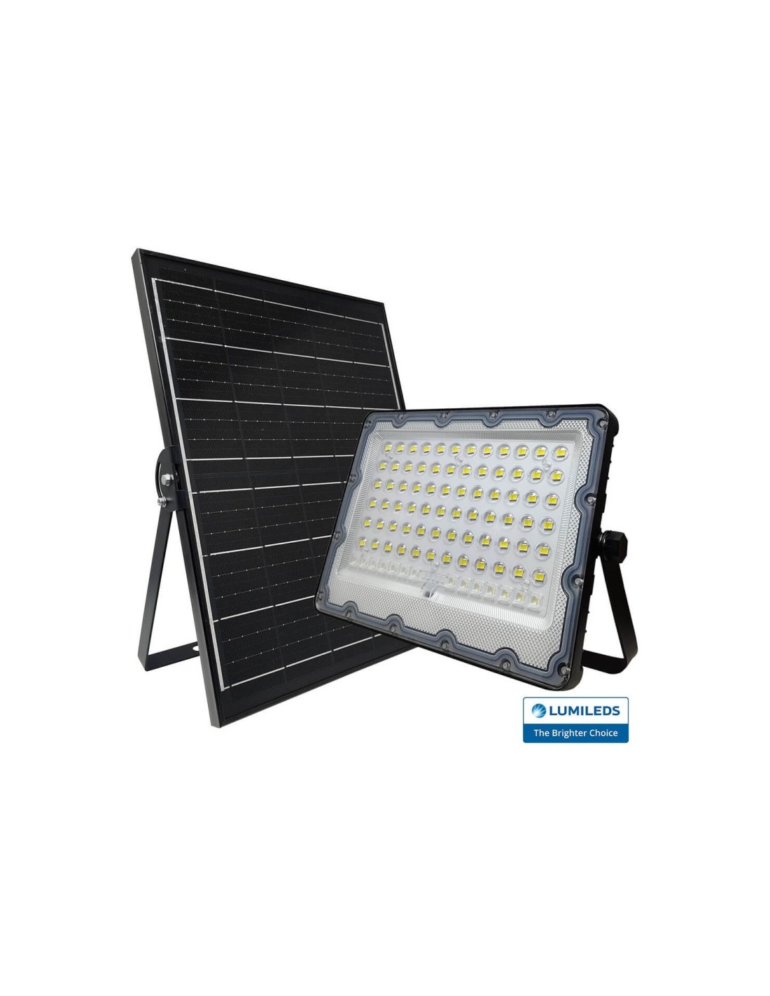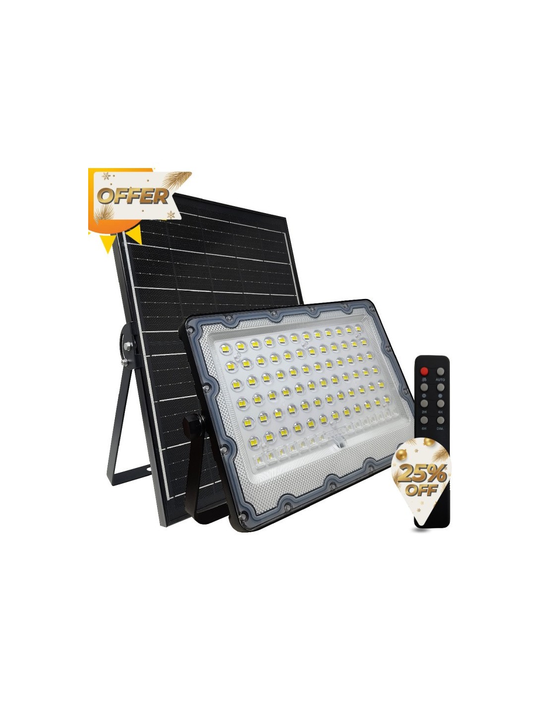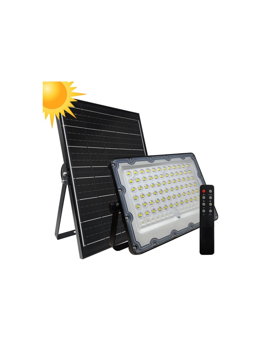 200W Solar-LED-Strahler mit kaltem Weißlicht 5700K, ohne Stromanschluss, völlig autonom mit polykristallinem Solarmodul mit 95cm Anschlusskabel, Solarzellenhalterung, Solar-LED-Projektor, Fernbedienung und Hardware zur Befestigung von Projektor und Solarzellen.