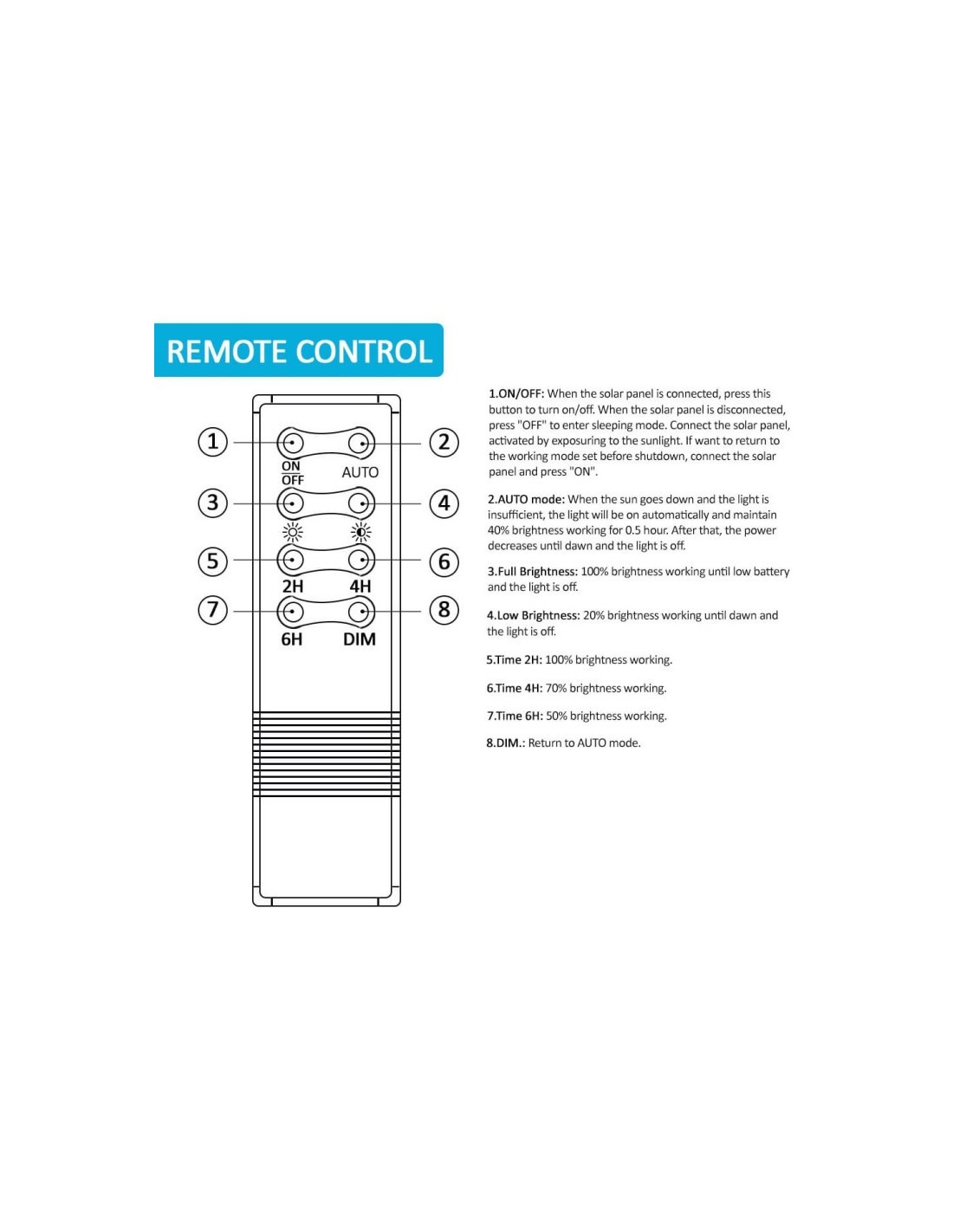 - AUTO-Modus: Wenn die Sonne untergeht und das Licht unzureichend ist, schaltet sich das Licht automatisch ein und bleibt 0,5 Stunden lang mit einer Helligkeit von 40% eingeschaltet. Danach wird die Leistung bis zum Sonnenaufgang verringert und das Licht schaltet sich aus.