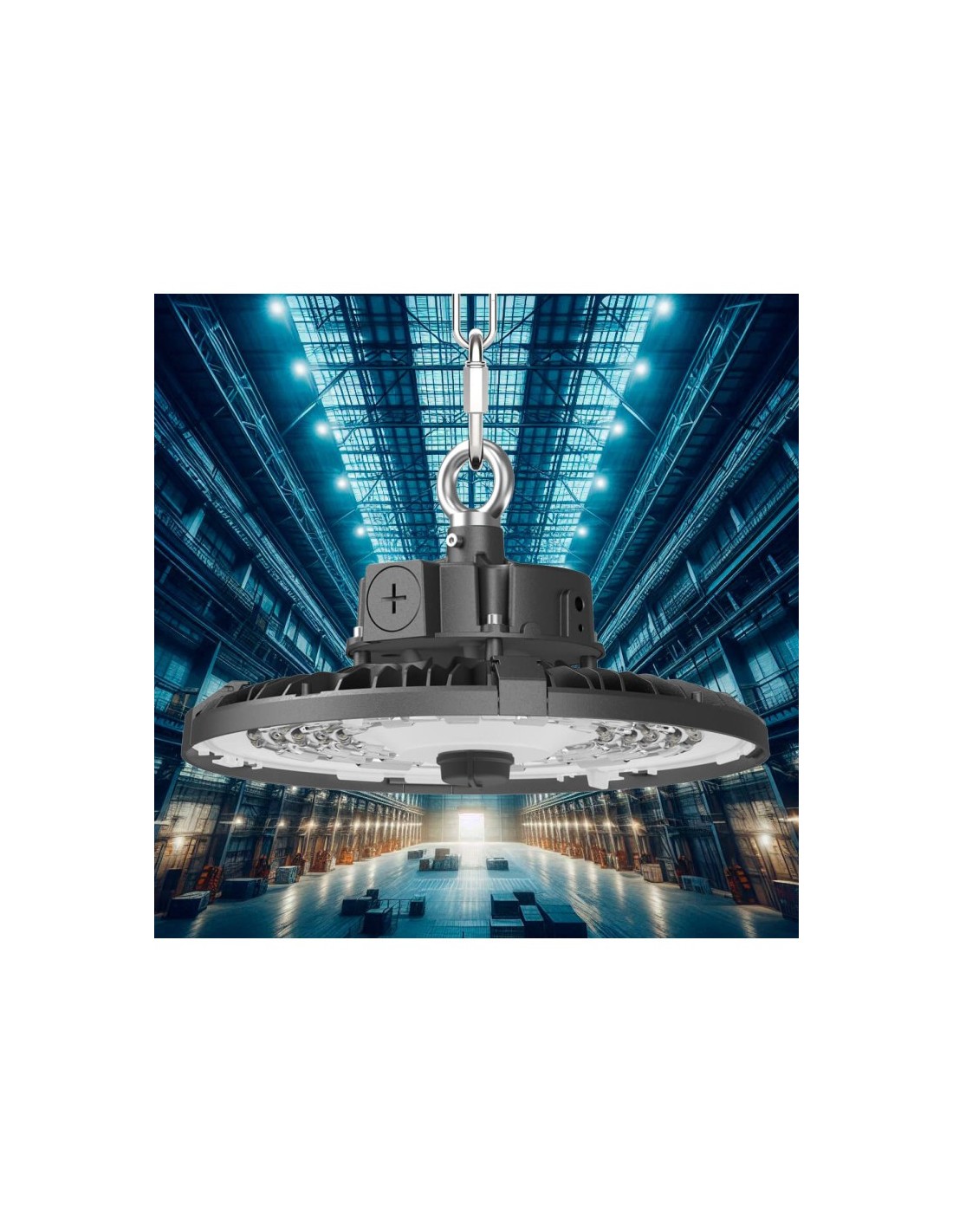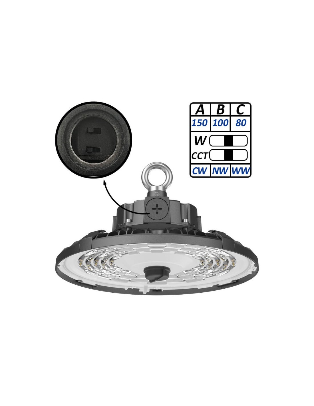 - Einstellbare Leistung: Die Industrielle LED-UFO-Leuchte FRANCE bietet ein besonderes Merkmal, das es den Nutzern ermöglicht, die Lichtleistung an ihre spezifischen Bedürfnisse anzupassen. Dank ihres Leistungsschalters kann die Beleuchtung auf 150W, 100W oder 80W eingestellt werden.
