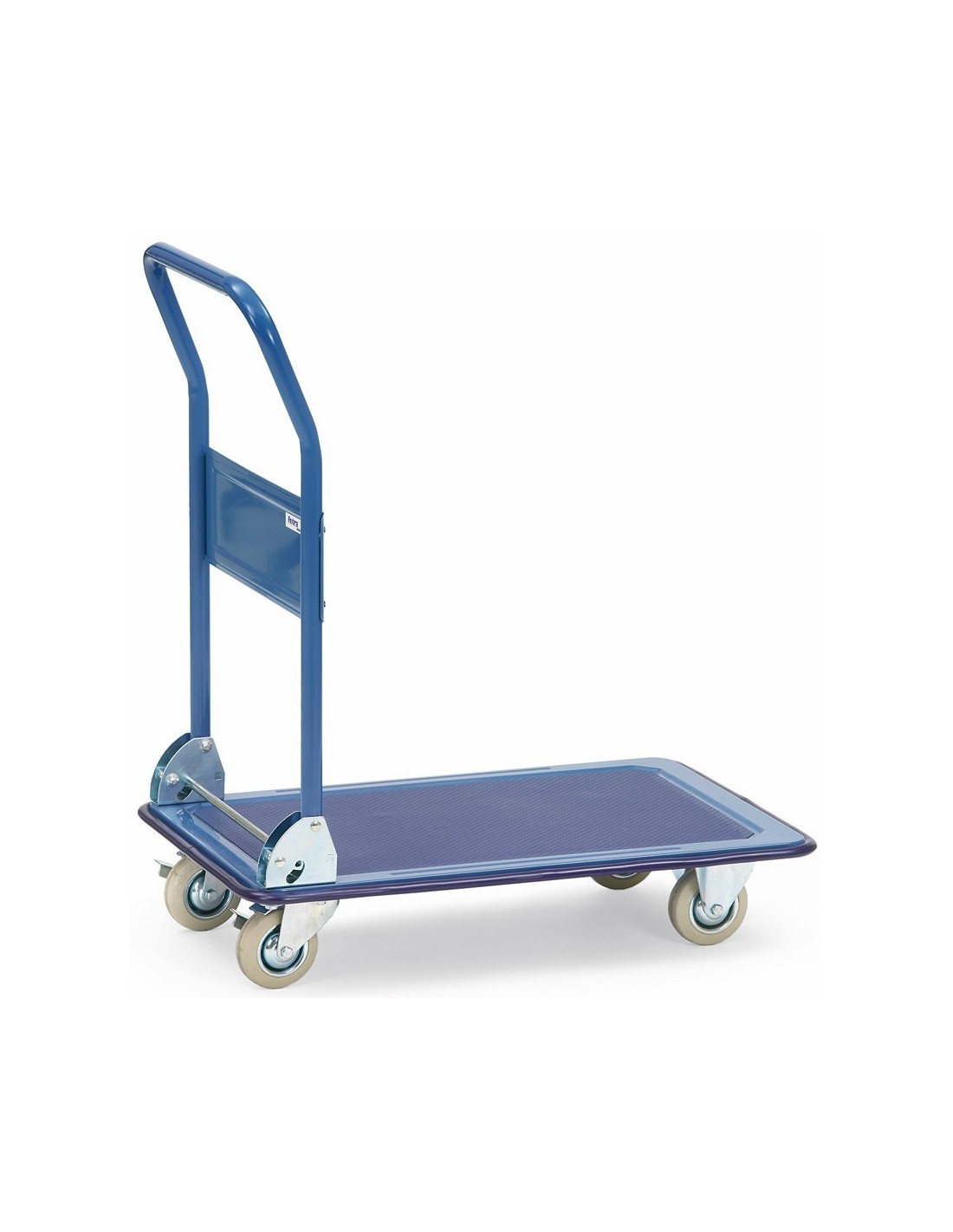 Plattformwagen Ganzstahl aus Stahlblech gepresst, pulverbeschichtet blau RAL 5007, mit aufgeklebtem Antirutschbelag und umlaufender Schutzleiste. Rohrschiebebügel klappbar, mit breiter Querstrebe, pulverbeschichtet, Klappgelenk glanzverzinkt. 2 Lenk- und 2 Bockrollen, Vollgummibereifung, Feststeller an den Lenkrollen. Zerlegte Anlieferung.