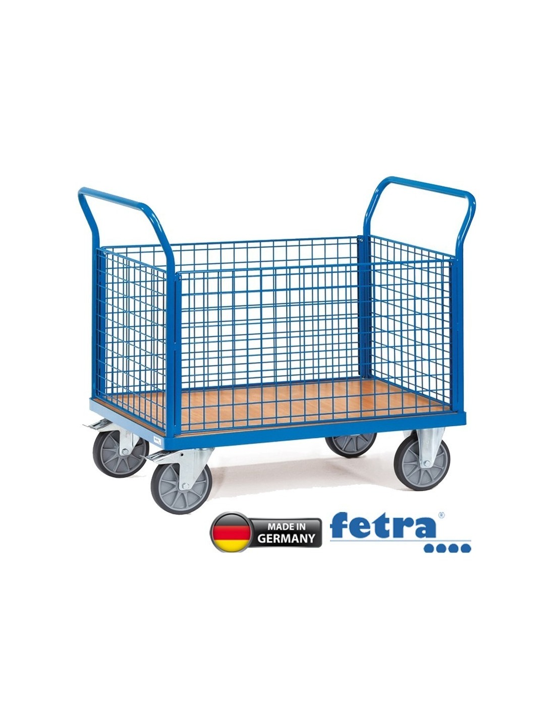 Dieser Vierwandwagen ist aus geschweisstem Stahlrohr und Profilstahl gefertigt und in blau RAL 5007 pulverbeschichtet. Die Plattform besteht aus einer Holzwerkstoffplatte mit Buchendekor-Oberfläche. Die zwei Stirnwände und zwei Längswände sind aus Drahtgittern mit einer Grösse von 50 x 50 x 4 mm und einer Höhe von 500 mm gefertigt. Eine der Längswände ist herausnehmbar, um das Be- und Entladen zu erleichtern. Die Mobilität des Wagens wird durch 2 Lenk- und 2 Bockrollen mit TPE-Bereifung und Naben mit Rillenkugellager gewährleistet. Zusätzliche Sicherheit bietet der Feststeller an den Lenkrollen, der den europäischen Normen EN 1757-3 entspricht.