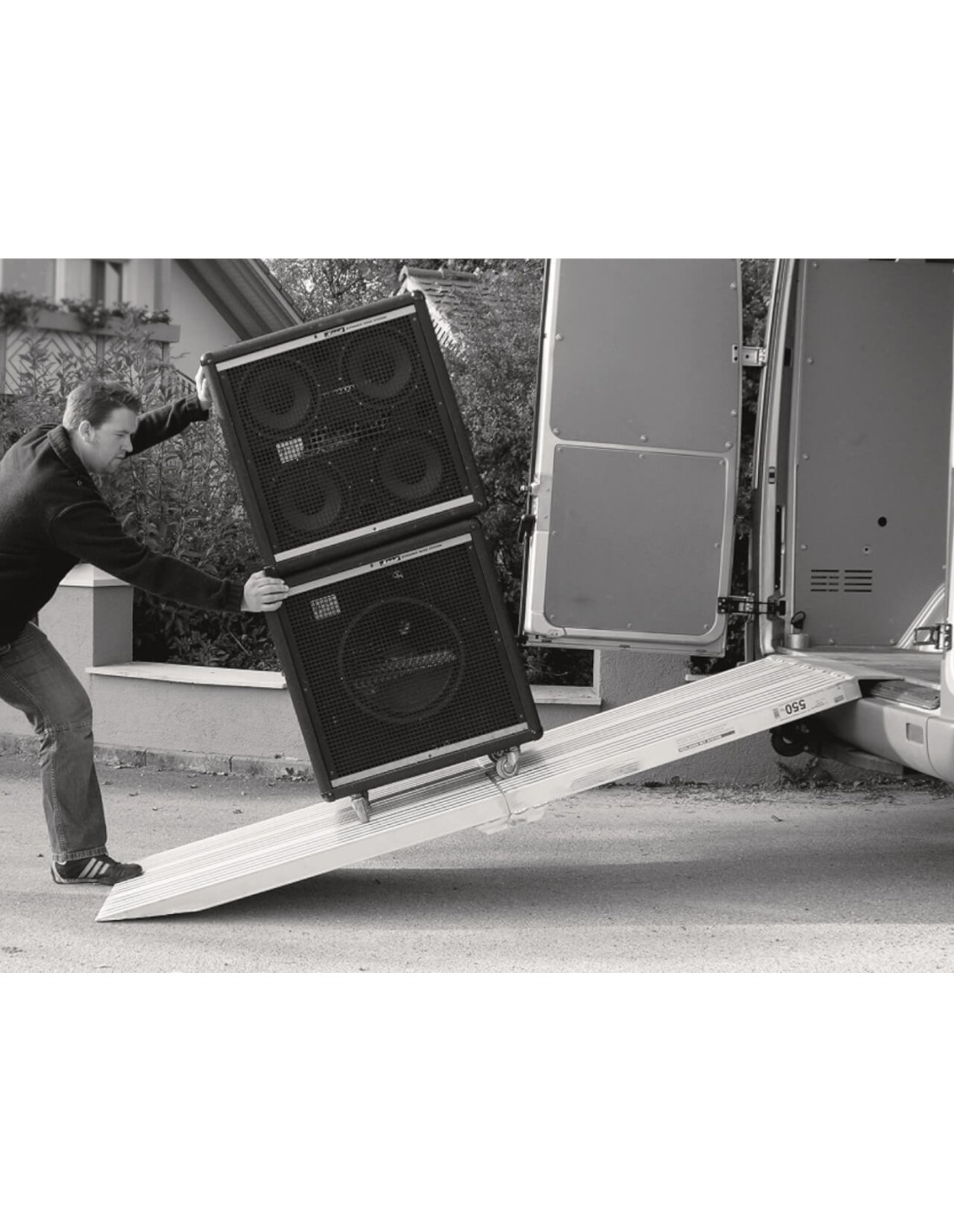 Superkompakte Breitrampen mit robusten Gelenken aus hochfestem Aluminium-Strangpressprofil optimieren das Packmass, wenn es auf jeden Zentimeter ankommt. Sie können bequem in Kompaktfahrzeugen wie Sprinter oder Transit mitgeführt werden, ohne wertvollen Laderaum zu blockieren. Extralange Auflager überbrücken die Stossstange oder Kunststoffverkleidung. Die trittsichere Profilierung weist eine gute Rutschhemmung auf. Auf Wunsch kann sie zusätzlich mit einer hochwertigen Antirutschbeschichtung ausgestattet werden. Im Event-Bereich werden damit schwere Behältnisse auf kleinen Rollen sicher und problemlos in Anhänger oder Fahrzeuge verladen. Auch kleinere GaLaBau-Geräte oder leichtere Fahrzeuge mit Luftbereifung können die Stege bequem befahren.