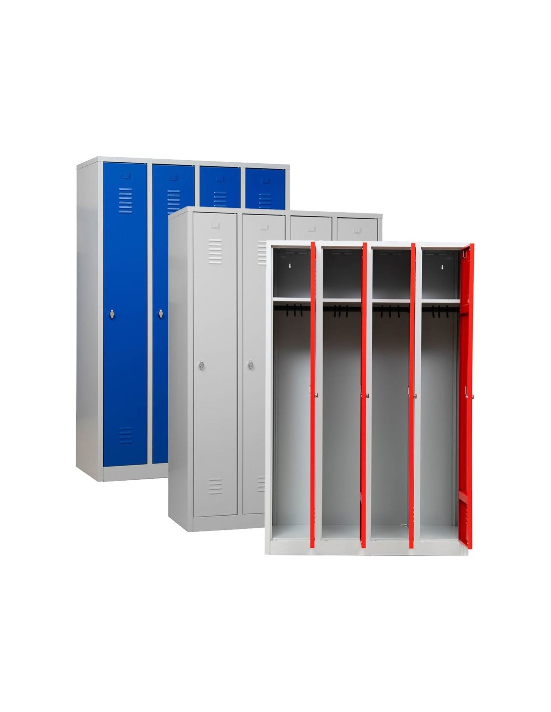 Wolfstahl Garderobenschrank Kleiderspind 4 Schliessfächer Lichtgrau - Feuerrot - Enzianblau