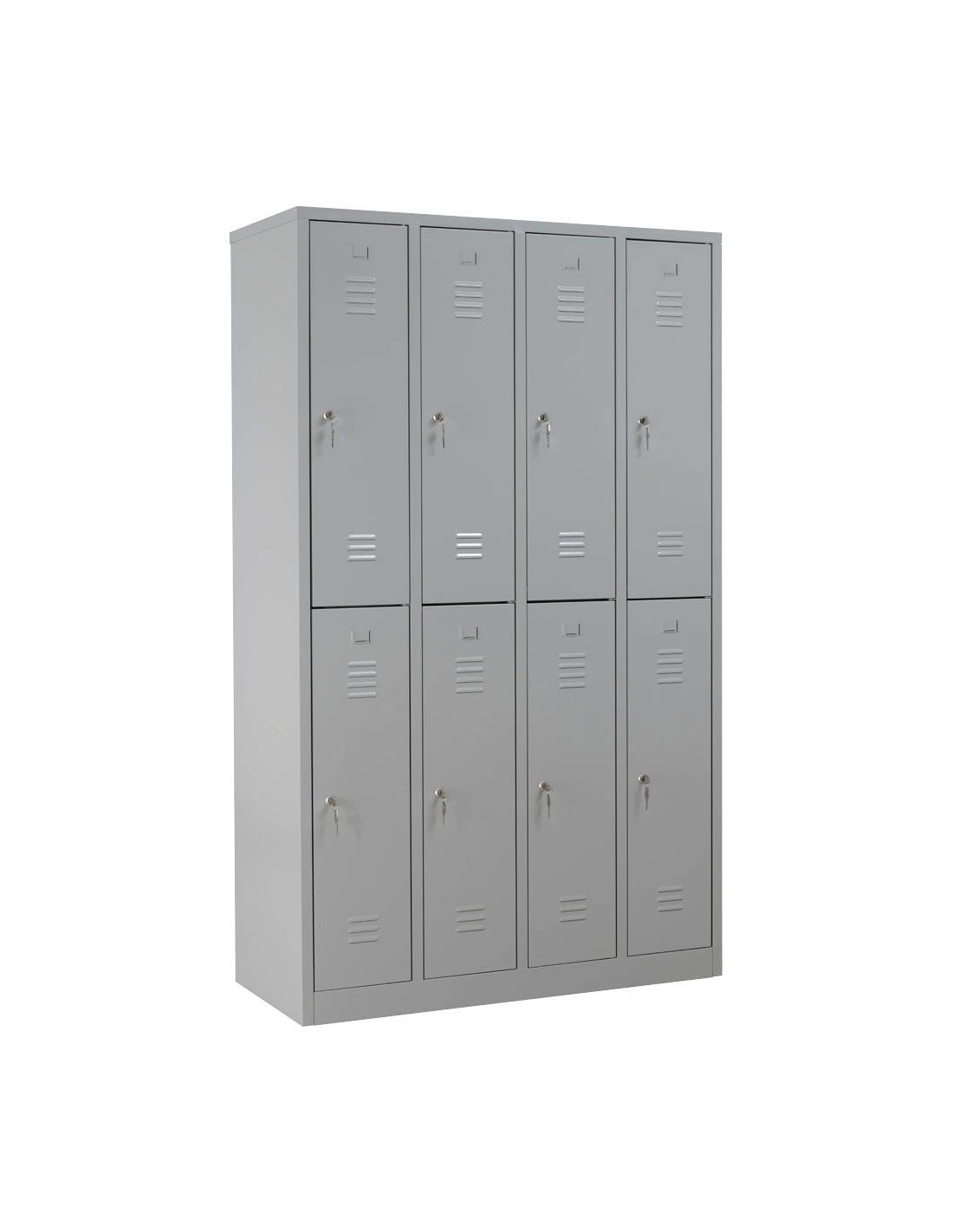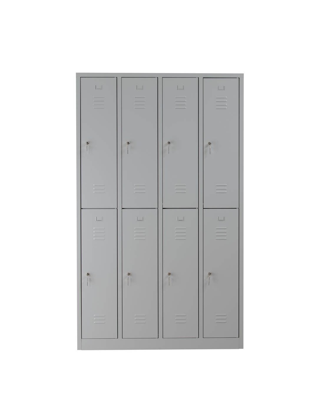 Die Belüftung über Schlitze im Gehäuse sorgen für eine optimale Luftzirkulation. So entstehen keine unangenehmen Gerüche. 8 einzelne Schliessfächer, angeordnet in 4 Abteilen, sorgen dafür, dass 8 Personen Ihre Habseligkeiten und Wertgegenstände sicher aufbewahren können. Ausreichend Stauraum findet sich dank einer Fachbreite von 30,0 cm. Was die Innenausstattung angeht, erwartet Sie Folgendes: pro Abteil 1 Kleiderstange mit Schiebehaken. Zusätzlich punktet der Wolfstahl Spind mit folgender Eigenschaft: mit Sockel.