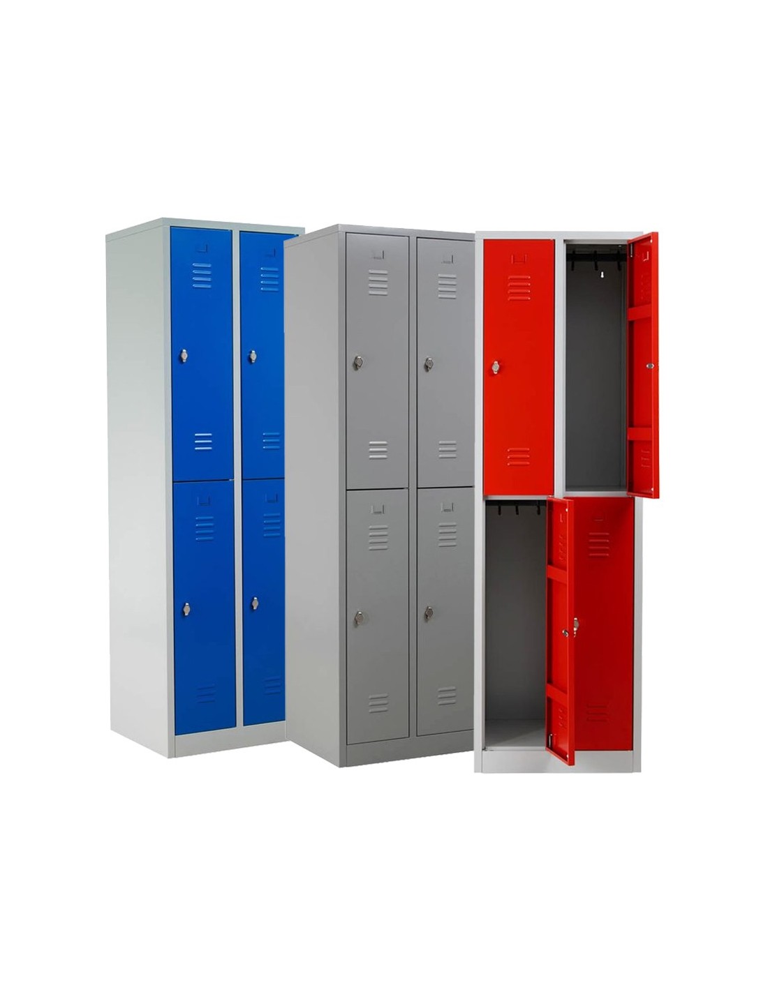 Wolfstahl Garderobenschrank Kleiderspind 4 Schliessfächer Lichtgrau - Feuerrot - Enzianblau
