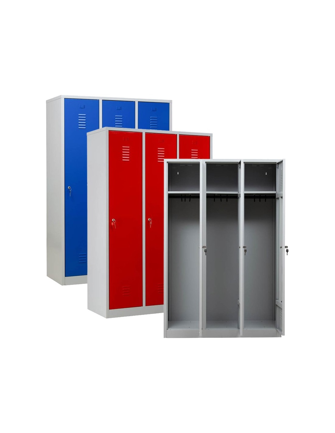 Wolfstahl Garderobenschrank Kleiderspind 3 Schliessfächer Drehriegelverschluss Lichtgrau - Feuerrot - Enzianblau