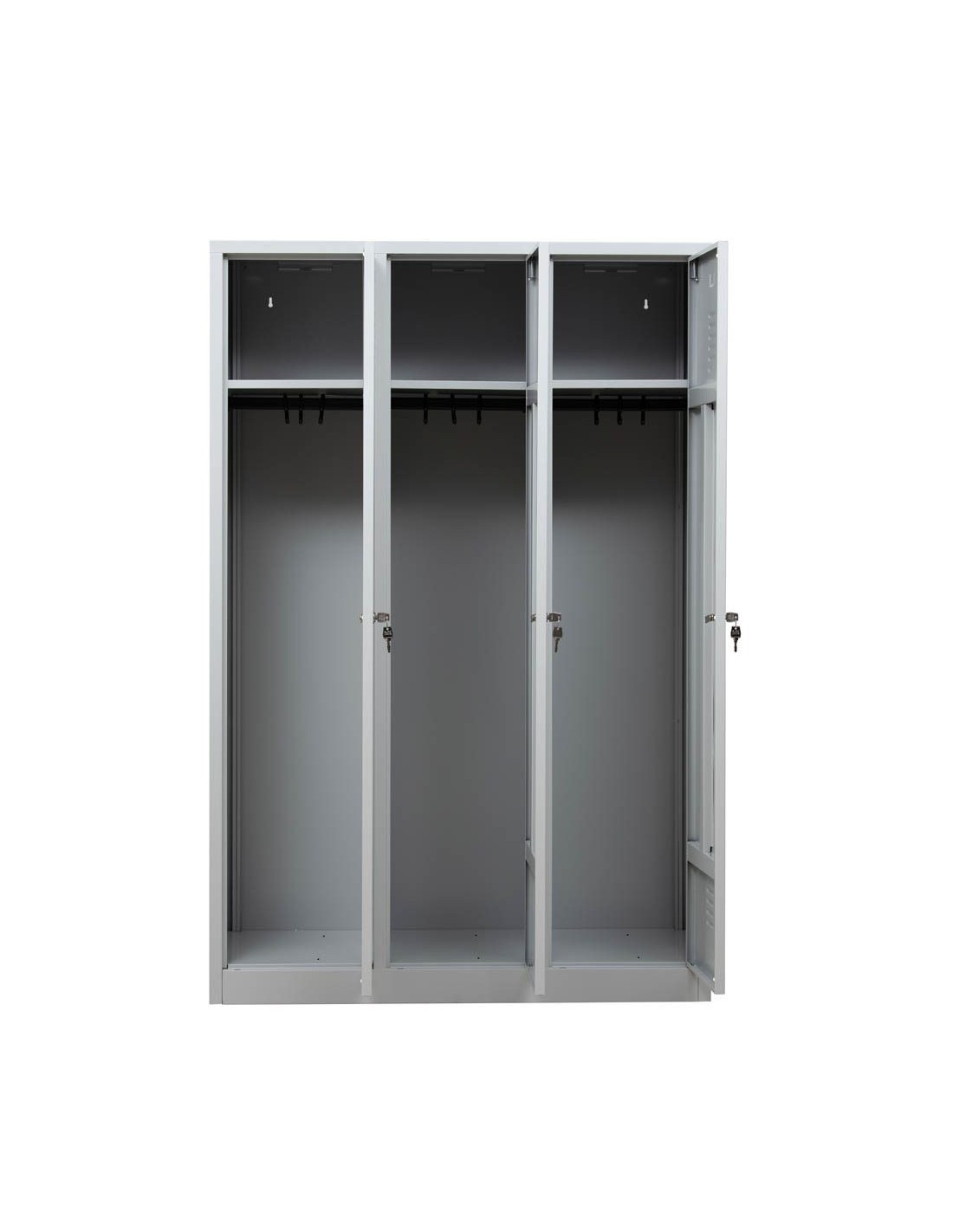 In den insgesamt 3 Schliessfächern, die in 3 Abteile angeordnet sind, können 3 Personen Ihre Wertgegenstände und andere Habseligkeiten sicher aufbewahren. Genügend Platz findet sich dank einer Fachbreite von 40,0 cm. Die folgenden praktischen Bestandteile gehören zur Innenausstattung: pro Abteil 1 Fachboden, 1 Kleiderstange mit 3 Schiebehaken. Beachten Sie ausserdem diese besondere Eigenschaft: mit Sockel. Die Luftzirkulation, die dank der Schlitze im Gehäuse gegeben ist, lässt keine unangenehmen Gerüche entstehen.