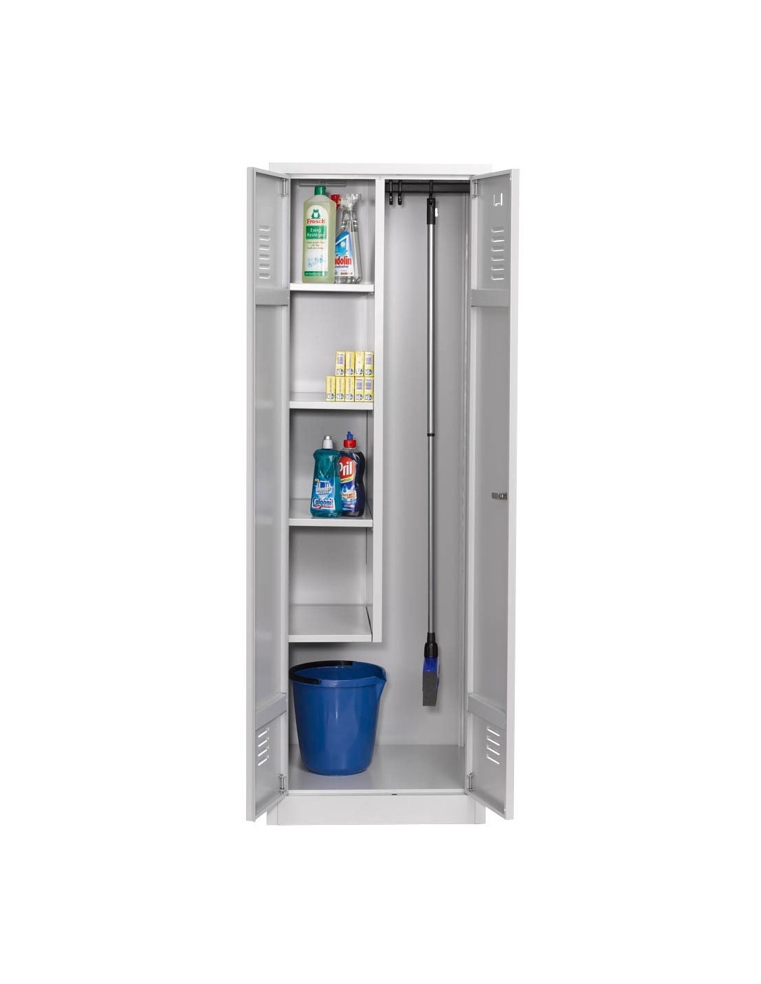 Der Wolfstahl Putzmittelschrank, 60,0 x 50,0 x 180,0 cm, aufgebaut gibt Ihren Reinigungsutensilien und Putzmitteln eine ordentliche Aufbewahrung. So beseitigen Sie gleichzeitig auch risikoreiche Stolperfallen, da z.B. Reinigungsgeräte oder Eimer nicht mehr im Weg stehen.