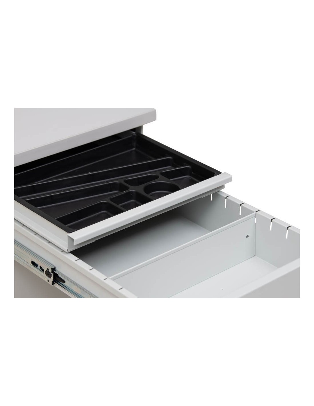 Sie erhalten einen Artikel mit einer beständigen Qualität, denn der Korpus ist aus Metall gefertigt. Machen Sie sich keine Gedanken über unschöne Schrammen oder Flecken. Die unempfindliche Pulverbeschichtung schützt vor bleibenden Schäden z.B. nach Stössen. Sie sorgt auch für eine leichte Reinigung. Für ein modernes Arbeitsumfeld eignet sich die Farbe Lichtgrau des Möbelstücks perfekt. Sie lässt sich sehr gut in jedes Büro integrieren.