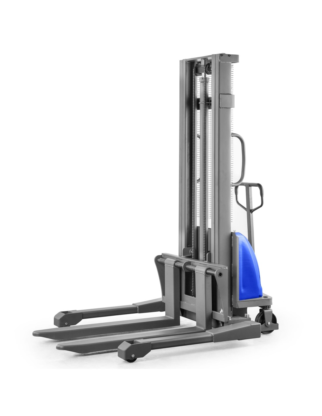 Unser halbelektrischer Breitspur-Hochhubwagen WIDE-E zeichnet sich durch seine individuell einstellbaren Gabeln aus. Genau richtig für Arbeiten mit Einwegpaletten mit Sondermassen oder die Queraufnahme von Europaletten.