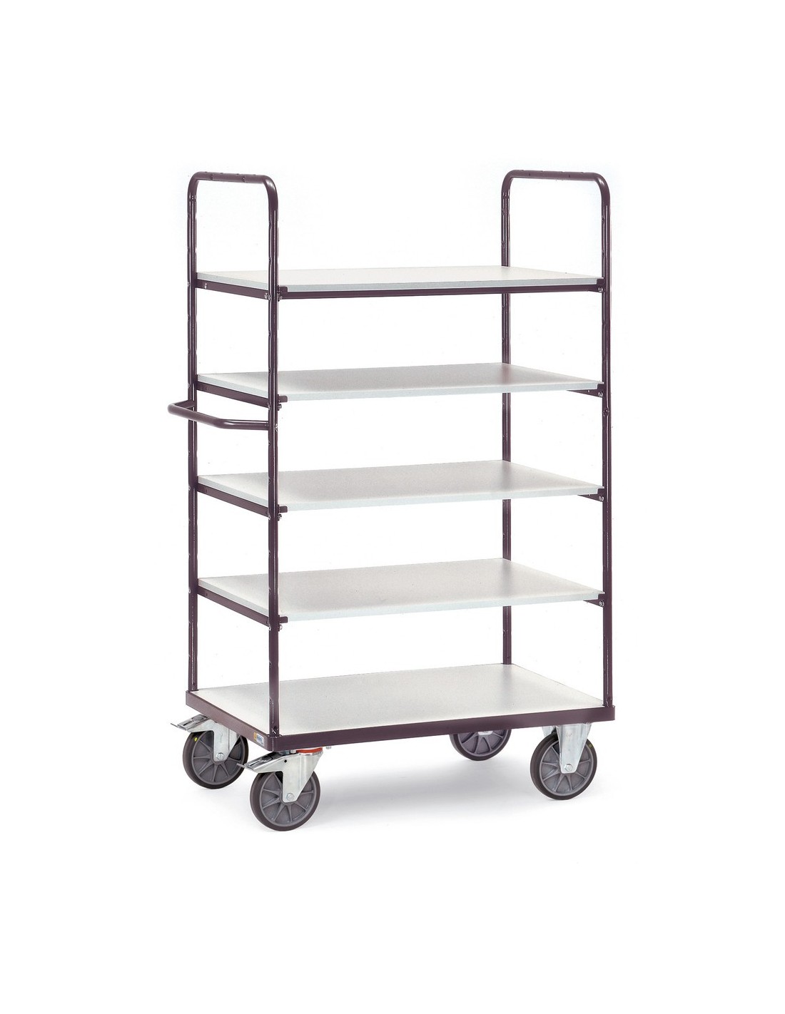 Mit 2 Lenk- und 2 Bockrollen ist der Etagenwagen einfach zu manövrieren und verfügt über Feststeller an den Lenkrollen, um ihn bei Bedarf sicher zu fixieren. Die Böden bestehen aus elektrisch leitfähiger Holzwerkstoffplatte nach DIN 68765, was eine sichere Lagerung der empfindlichen Bauteile ermöglicht.