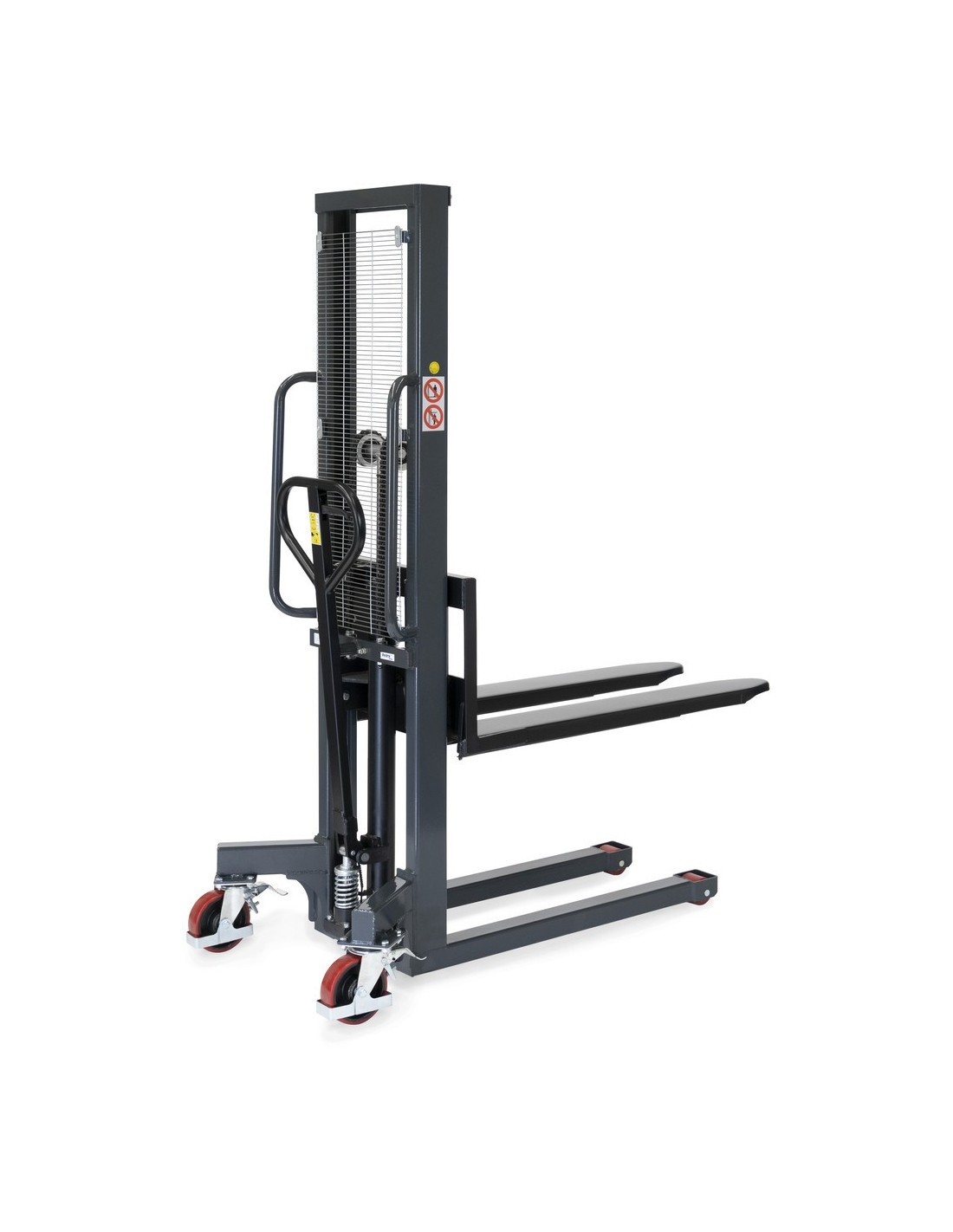 Technische Merkmale: Der Stapler verfügt über eine Hydraulikpumpe mit verchromten Kolben und Überlastventil. Die Betätigung erfolgt über die Zugdeichsel und das Senkventil über den Handhebel. Mit einer Tragbreite von 540 mm und einem Lastschwerpunktabstand von 585 mm bietet er optimale Stabilität und Sicherheit.