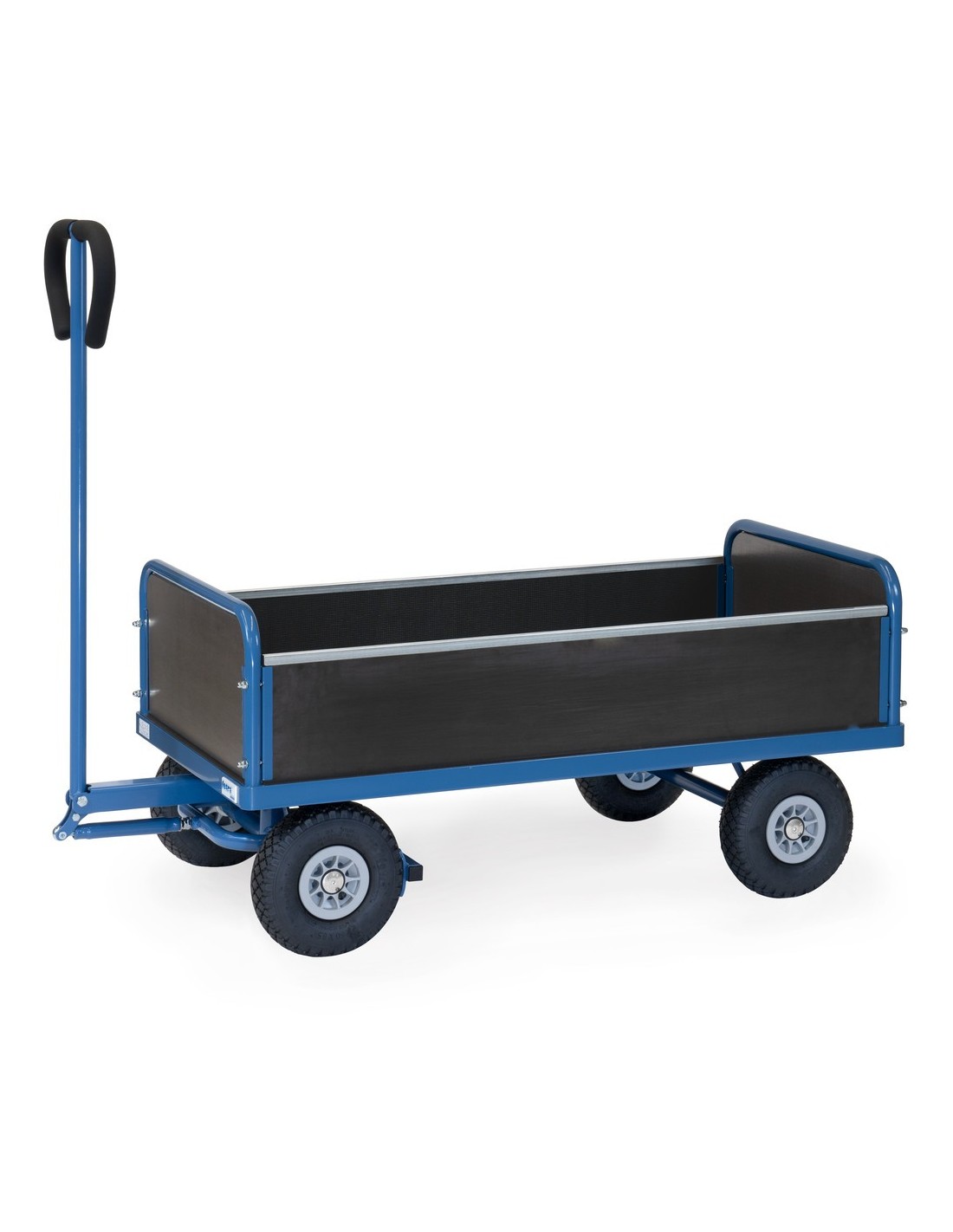 Der Handwagen verfügt über 2 Stirnwände mit einer Höhe von 300 mm und 2 Einstecklängswände mit einer Höhe von 220 mm, alle aus wasserfestem Sperrholz. Die Drehschemel-Lenkung mit Deichsel und Handgriff ermöglicht eine einfache Manövrierbarkeit.