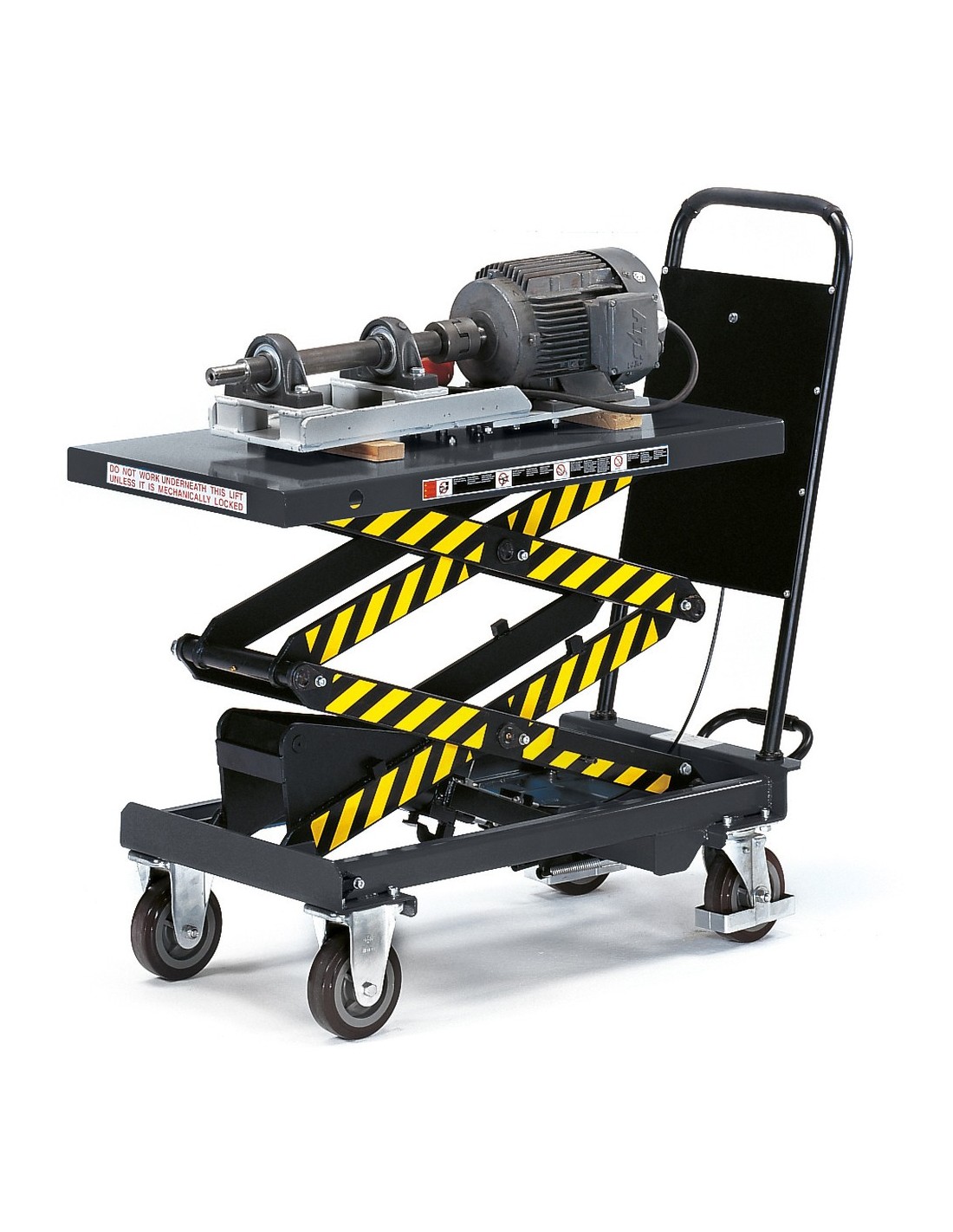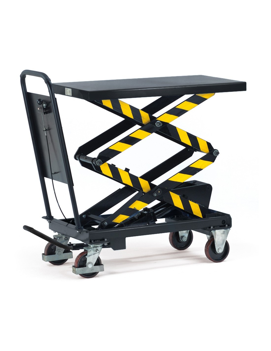 Der Hubtischwagen verfügt über eine Doppelschere, die einen besonders grossen Hubbereich ermöglicht. Der kräftige Rohrschiebebügel und die feststehend verschraubte Rohrschiebebügel bieten zusätzliche Stabilität und Sicherheit.