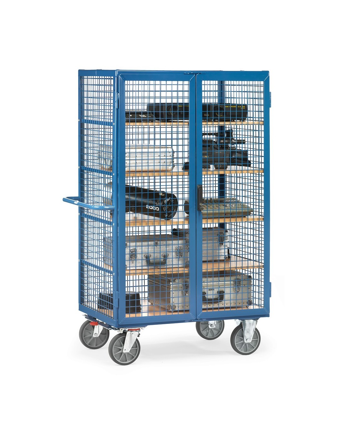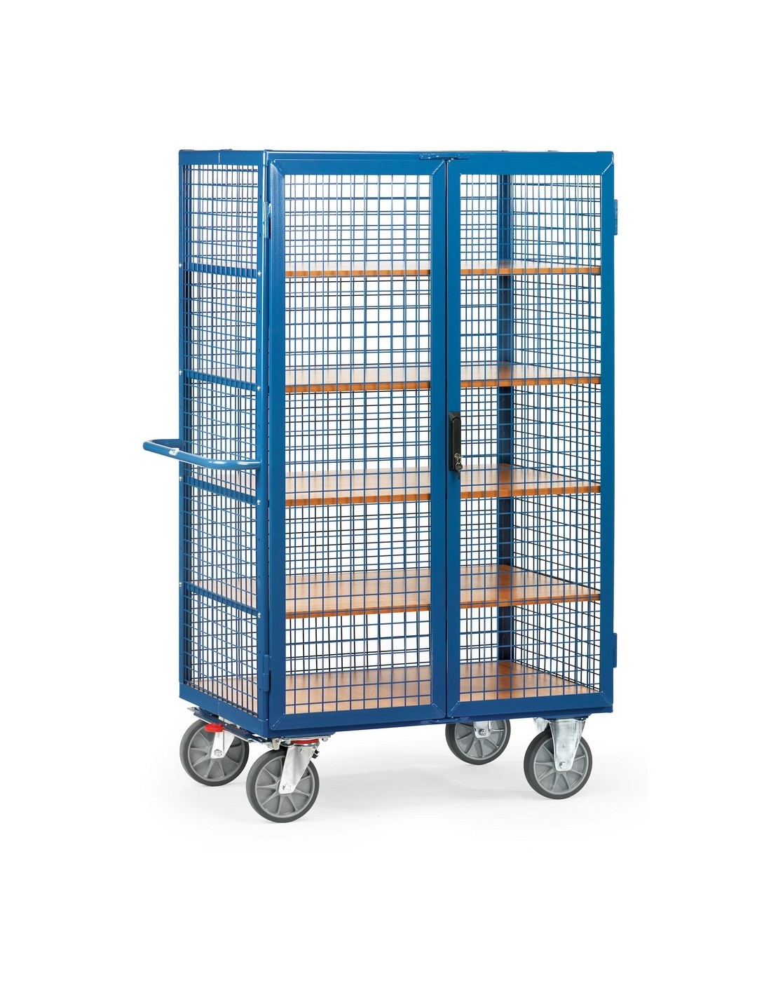 Dieser Kastenwagen von Fetra ist in einer stabilen Winkelstahl-Konstruktion gefertigt und in einem attraktiven Brillantblau pulverbeschichtet. Er verfügt über eine Doppelflügeltür aus Winkelstahl und einen Treibriegelverschluss für sicheres Verschliessen. Die Böden bestehen aus tragfähigen Sandwichplatten und sind variabel einsetzbar.