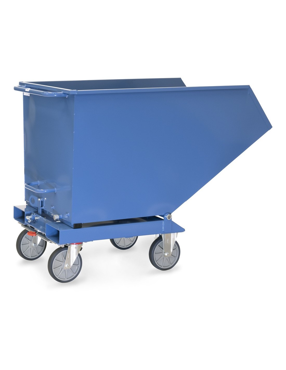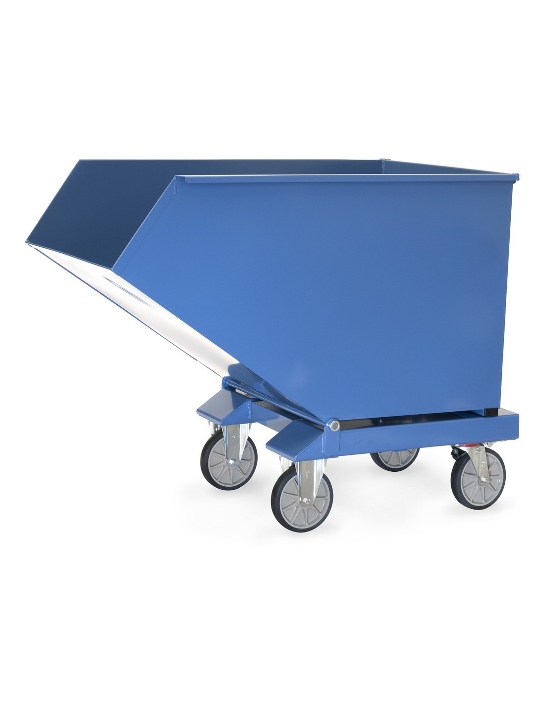 Technische Merkmale: - Zentralbremssystem Totalstop für maximale Sicherheit und Benutzerfreundlichkeit - Kippbare Mulde aus 2 mm starkem Stahlblech mit öldichter Verschweissung - Robustes Untergestell aus 3 mm starken Kantprofilen mit Staplertaschen - Pulverbeschichtung in Blau nach RAL 5007 - Ausgestattet mit 2 Lenk- und 2 Bockrollen mit TPE-Bereifung und Rillenkugellagern