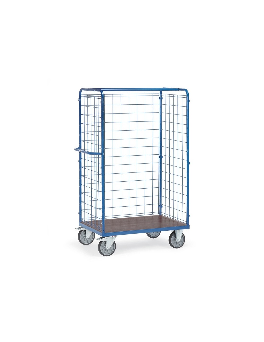 Dieser Paketwagen von Fetra bietet eine robuste Konstruktion aus geschweisstem Stahlrohr und Profilstahl, pulverbeschichtet in blau RAL 5007. Die Drahtgitterwände sorgen für Stabilität und Sicherheit beim Transport von Waren. Die Plattform besteht aus einer rutschsicheren Siebdruckplatte aus wasserfestem Sperrholz, was eine zuverlässige Nutzung in verschiedenen Umgebungen gewährleistet.