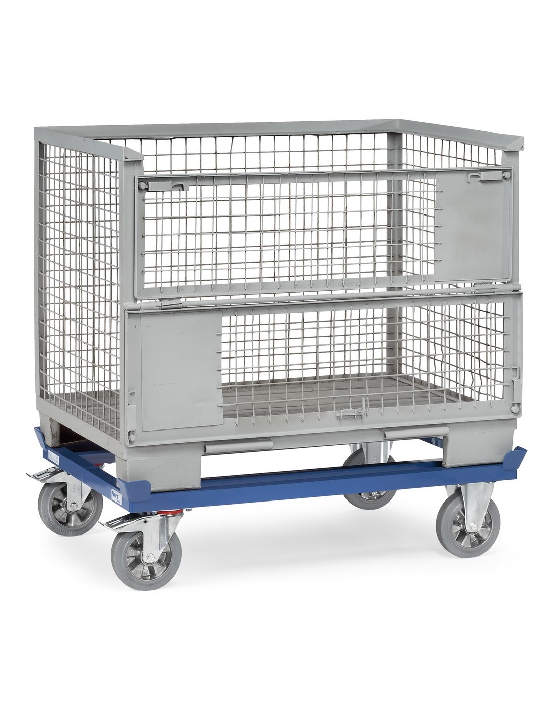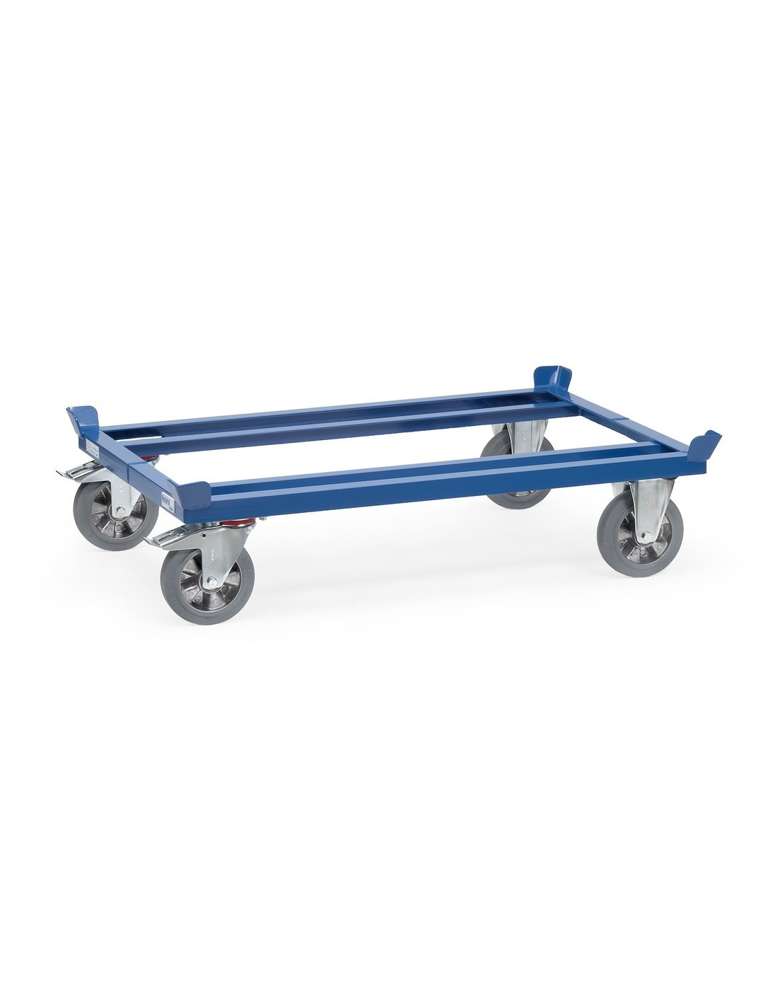 Dieses Paletten-Fahrgestell von Fetra ist ideal für den Transport von Flachpaletten und Gitterboxen geeignet. Die robuste Winkelstahl-Schweisskonstruktion in blauer Pulverbeschichtung sorgt für hohe Stabilität und Langlebigkeit.