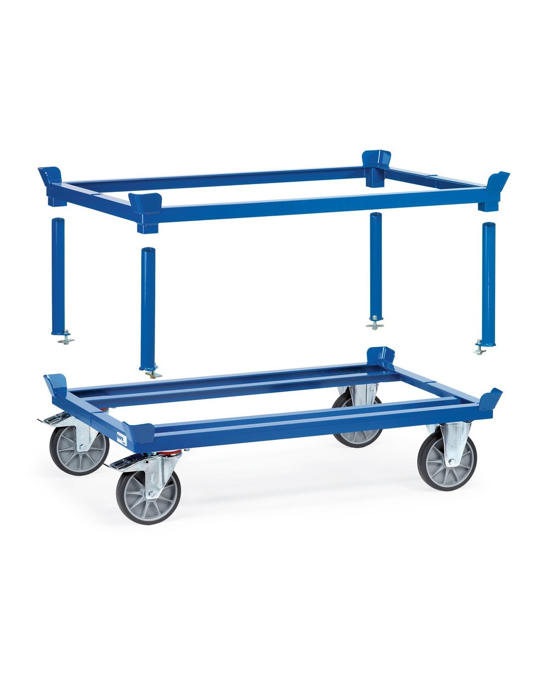 Dieses Fahrgestell eignet sich ideal für Flachpaletten und Gitterboxen. Es verfügt über eine robuste Winkelstahl-Schweisskonstruktion mit 4 Fangecken, die pulverbeschichtet in blau RAL 5007 sind. Die 2 Lenk- und 2 Bockrollen gewährleisten eine einfache Manövrierbarkeit.
