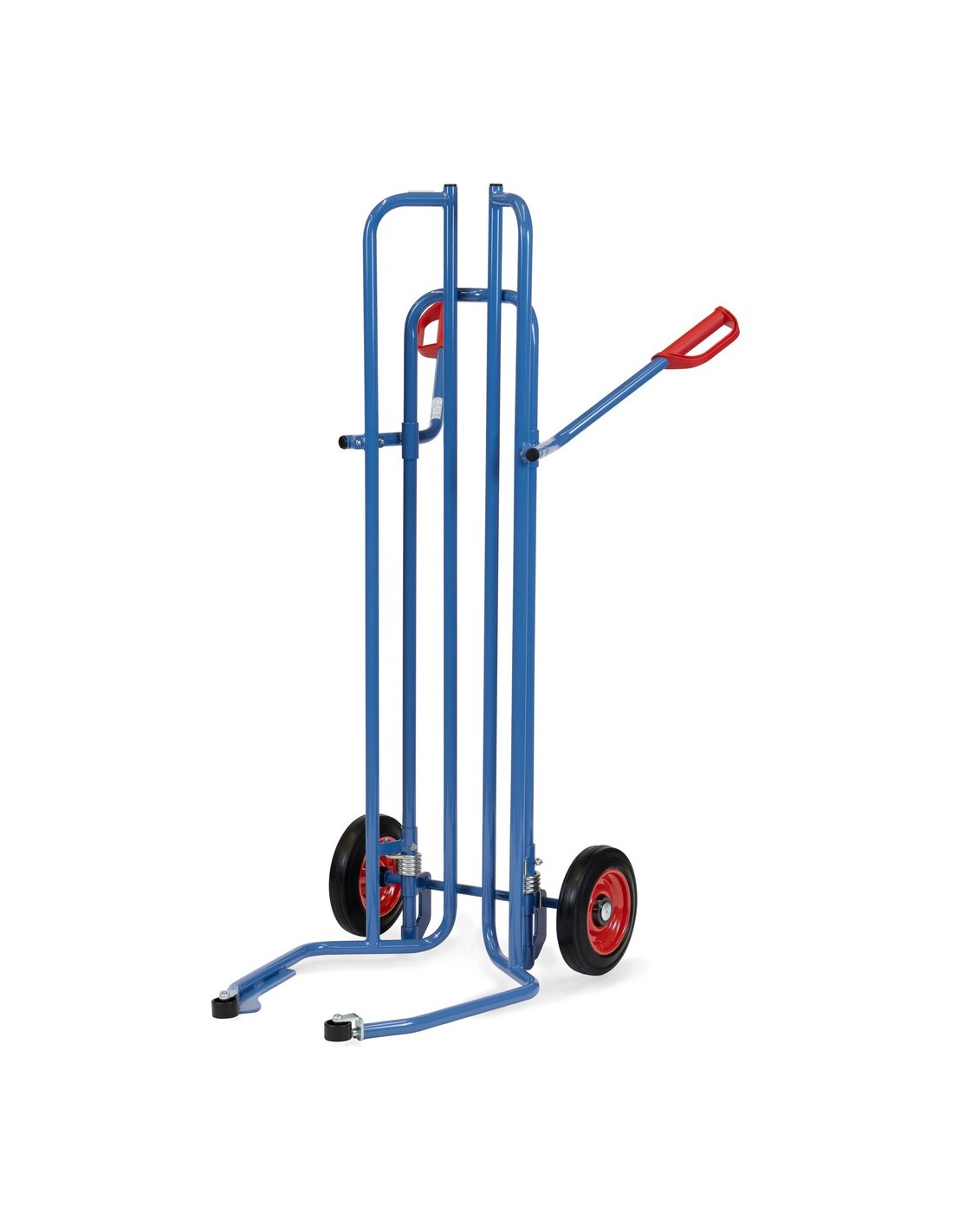 Die Reifenkarre kann wahlweise mit Vollgummi- oder Luftbereifung auf Kunststoff-Felgen ausgestattet werden und ist äusserst langlebig sowie für langfristige Wartungszeiträume konstruiert. Die geschweisste Konstruktion aus Stahlrohr ist pulverbeschichtet in blau RAL 5007, was eine dauerhafte Oberflächenschutz gewährleistet.