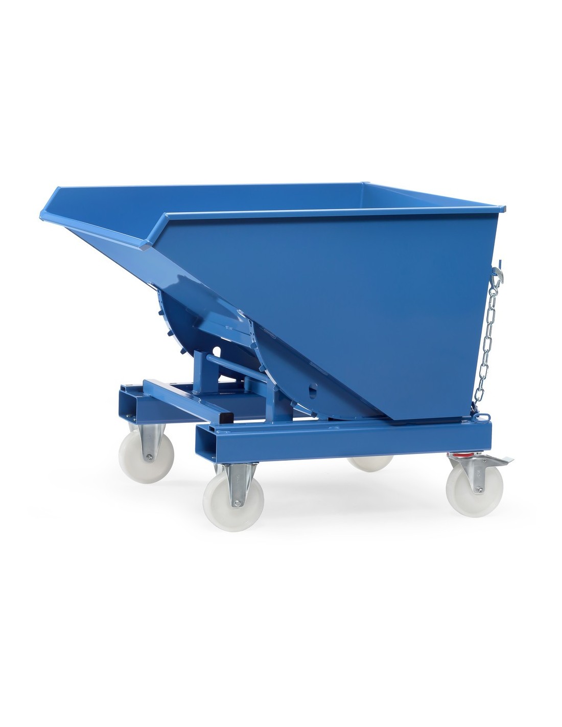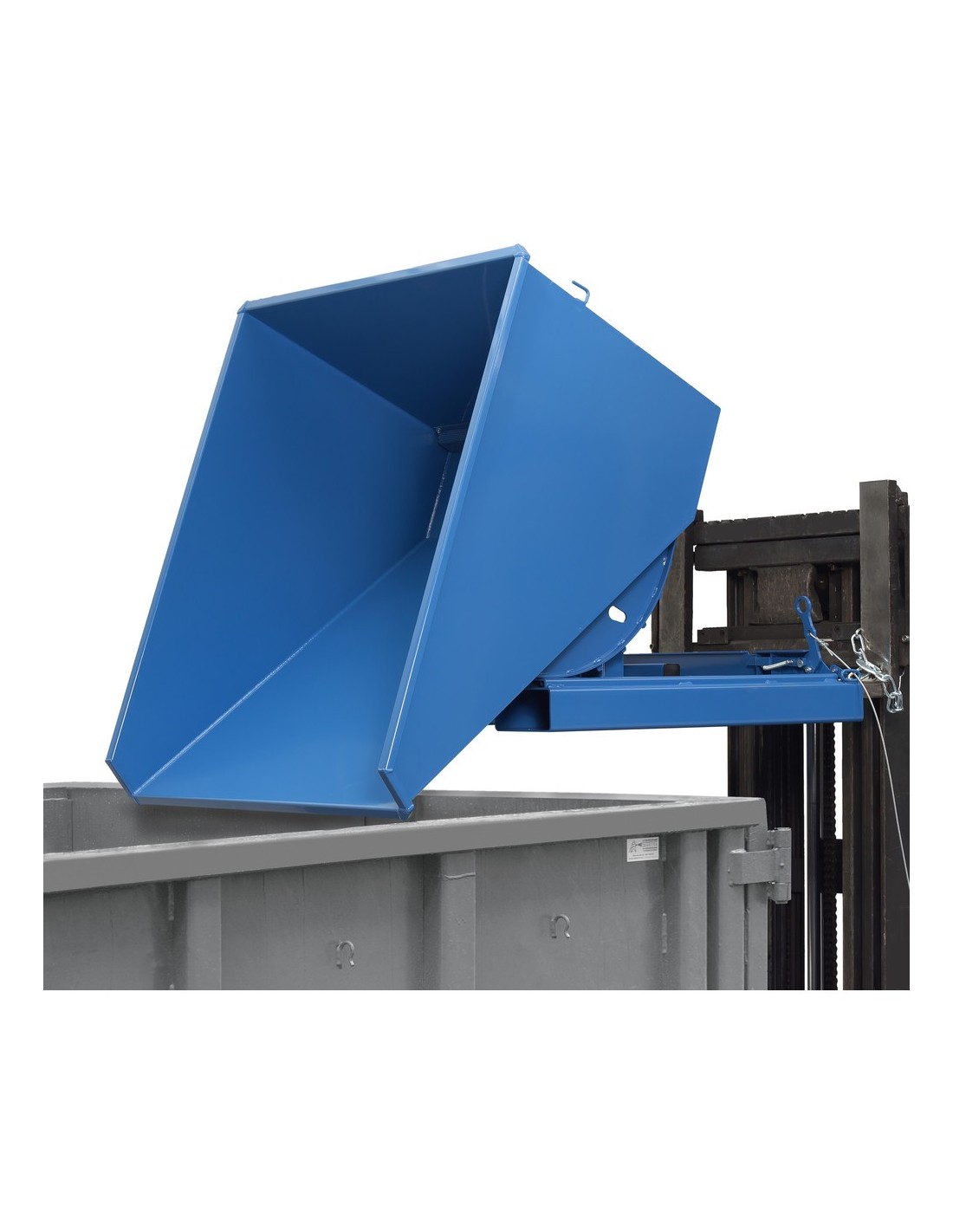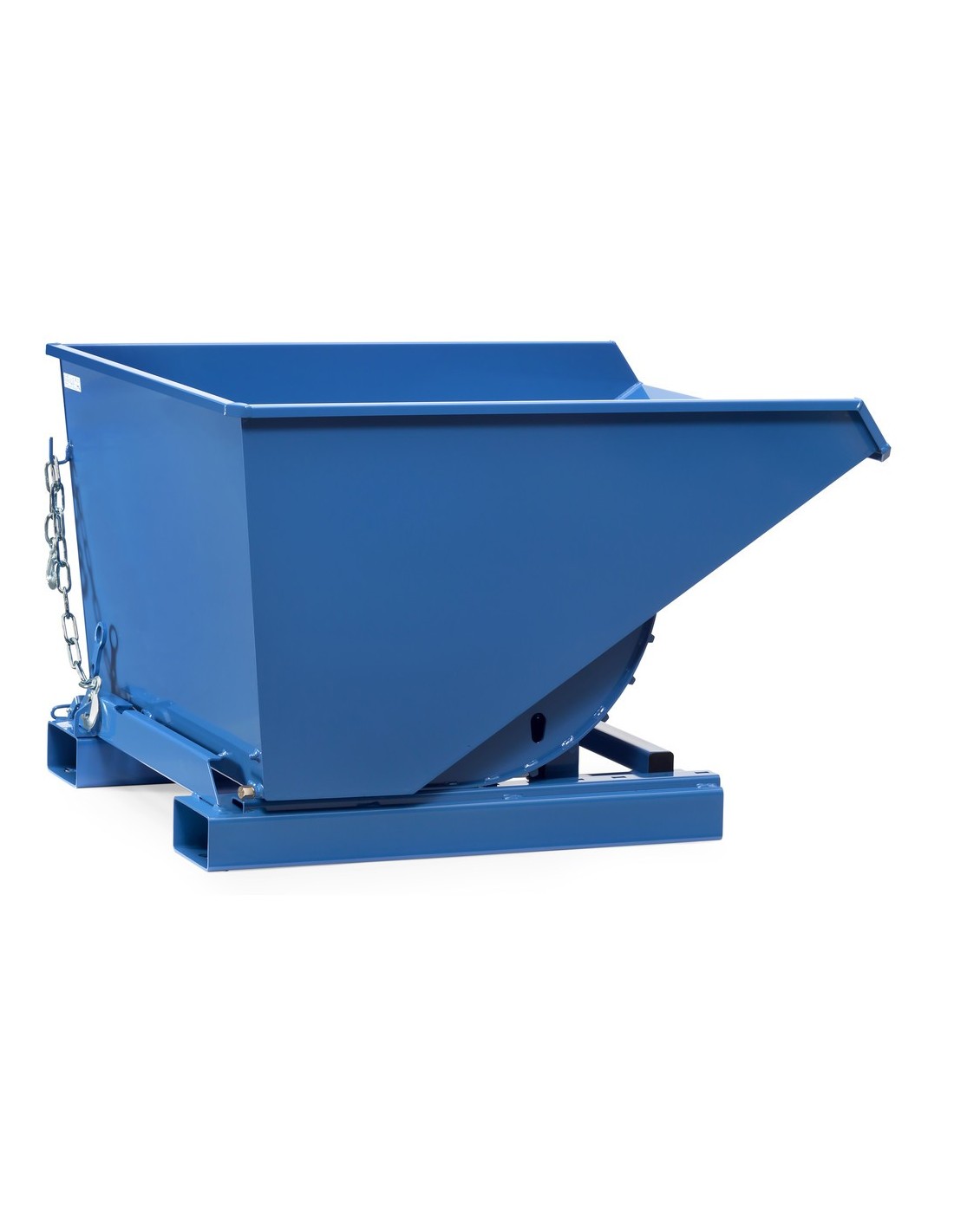 Selbstkipper für Schüttgüter zum selbsttätigen Abkippen über Kufen, auch extrem leichter Güter bei völliger Entleerung. Die leere Mulde geht selbstständig in die Beladestellung zurück. Diese robuste Schweisskonstruktion aus 3-mm-Stahlblech ist dicht verschweisst und pulverbeschichtet. Ausgestattet mit Staplertaschen, Abrollsicherung, Kippverriegelung und Gliederkette als Abrutsch- und Kippsicherung.