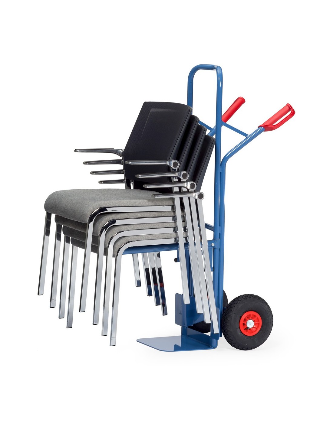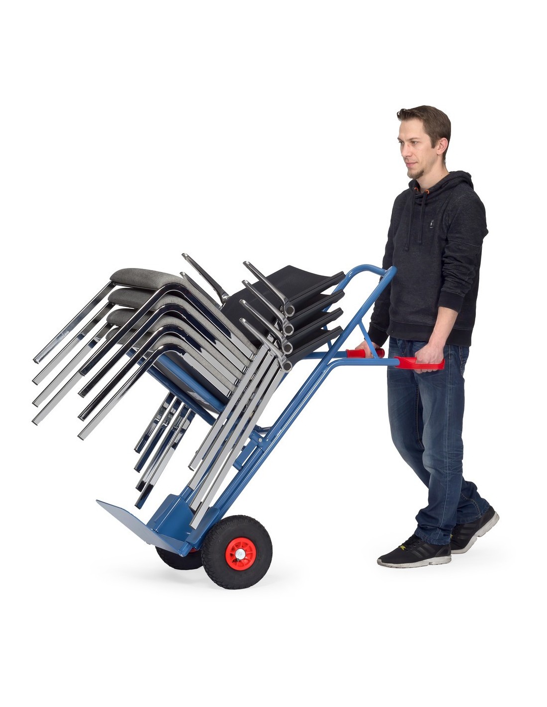 Kurze Beschreibung: Die Fetra Stuhlkarre eignet sich ideal zum Transport von gestapelten Stühlen und ist durch ihr Traggestell aus Stahlrohr besonders stabil und vielseitig einsetzbar.