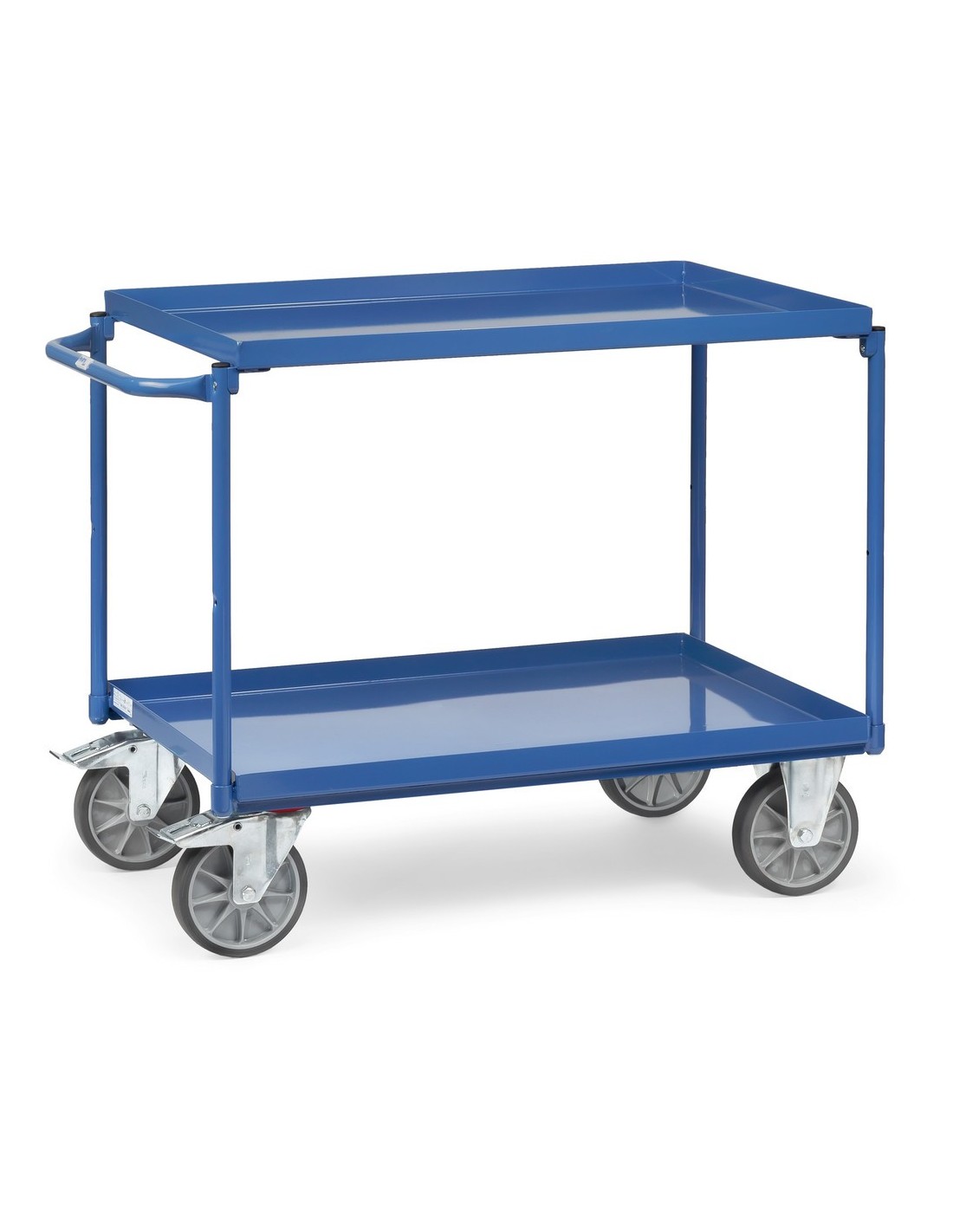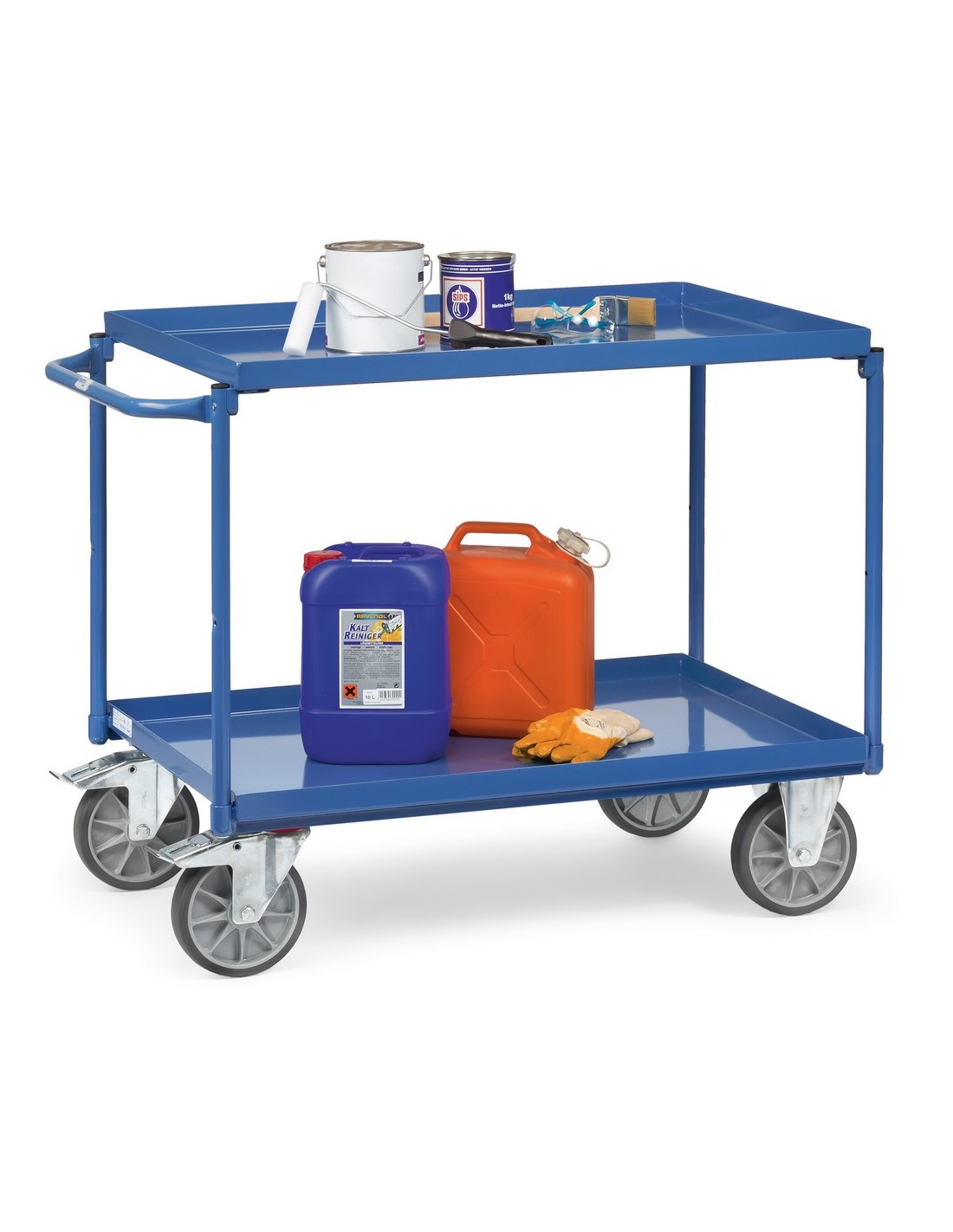 Der Fetra Tischwagen mit 2 Blechwannen in blau ist eine vielseitige und robuste Transportlösung für Lager und Büro. Die Stahlkonstruktion ist geschweisst und sorgt für eine hohe Stabilität. Mit einer Tragkraft von 200 kg auf der oberen Etage können auch schwere Lasten sicher transportiert werden.