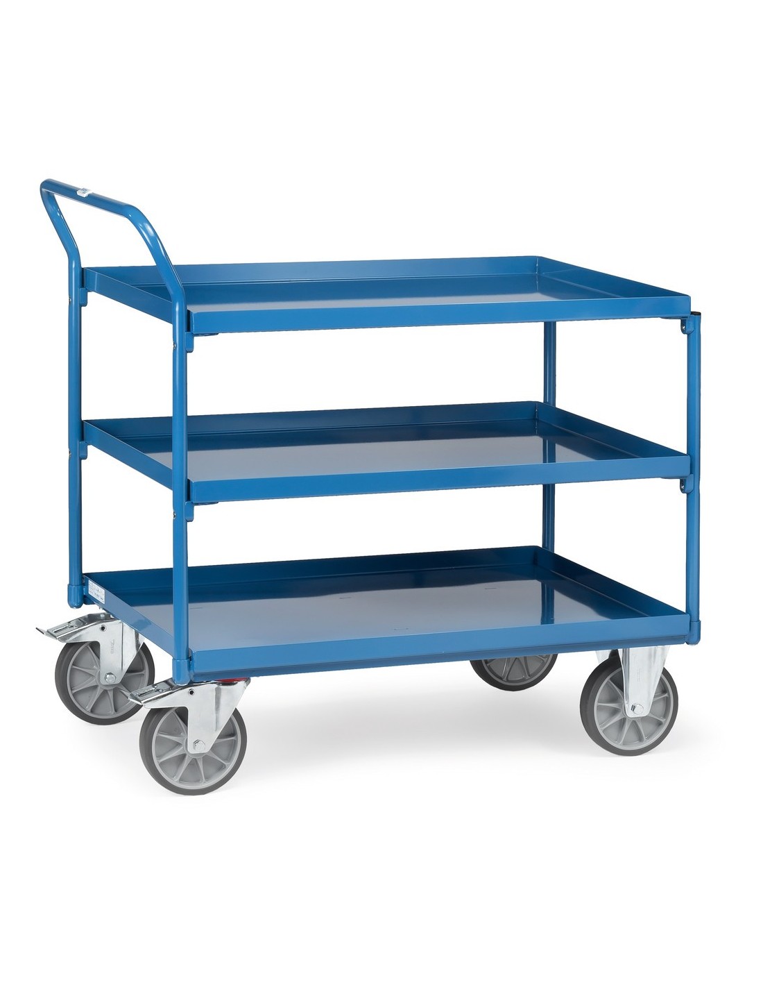 Der Fetra Tischwagen mit 3 Blechwannen und hochstehendem Griff ist ein vielseitiges Transportgerät, das im Lager und Büro eine echte Erleichterung darstellt. Die Stahlkonstruktion ist äusserst stabil und kann mit bis zu 200 kg beladen werden.